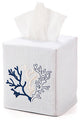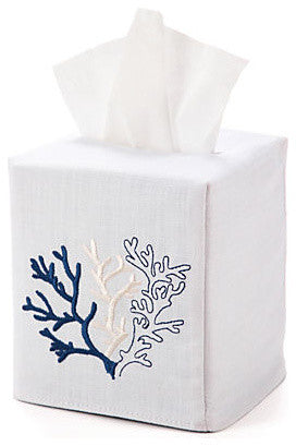 Linen Tissue Box Cover embroidered with coral. Made by Zulu women in South Africa.