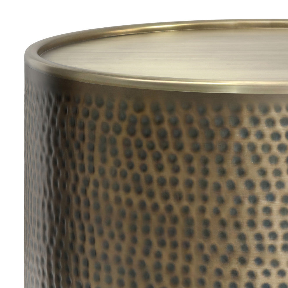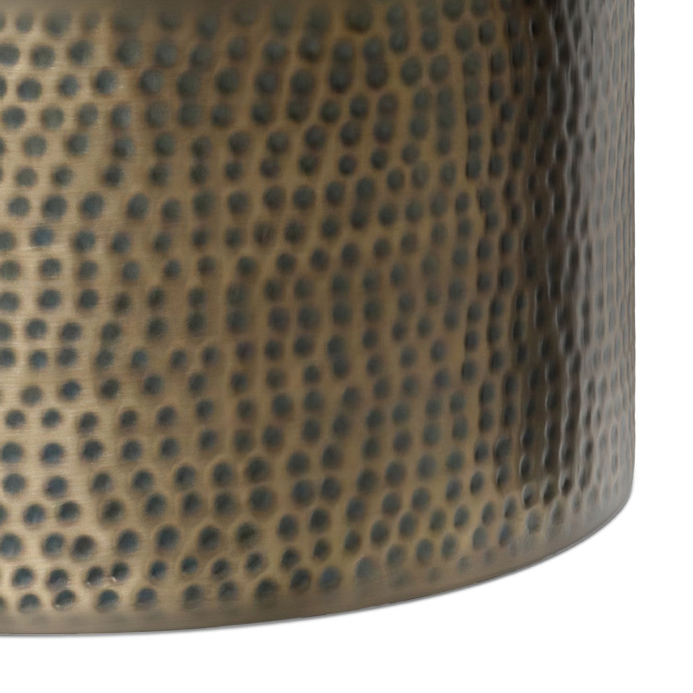 The Corbin Metal Coffee Table combines contemporary industrial style with artisanal craftsmanship to elevate your living space. Featuring a round drum silhouette with a textured hammered finish, this coffee table is crafted from durable iron metal and finished in a radiant antique gold tone. Its versatile design complements modern, transitional, and eclectic decor, while the sturdy construction ensures lasting quality. With a compact 32-inch diameter and 16-inch height, it is perfect for creating a stylish focal point in your living room or entertaining guests with elegance and charm. Perfect for small spaces and larger family rooms. Dimensions: Handcrafted, multifunctional 32" diameter x 16" height round drum coffee table with a hammered metal texture and a striking antique gold finish; perfect for small to medium-sized living spaces.Elegant Design: The round drum silhouette with a hammered metal texture and antique gold finish adds an artisanal touch to contemporary, modern, or transitional interiors.Durable Craftsmanship: Constructed with sturdy iron metal and a powder-coated finish to ensure long-lasting quality and resistance to wear and tear.Lightweight and Sturdy: The compact, lightweight design allows for easy placement, while the sturdy base ensures stability and functionality for everyday use.Multifunctional Use: Serves as a stylish centerpiece for entertaining, a decorative display surface, or a convenient table for snacks and beverages.Perfect Pairing: Complements a variety of seating arrangements, creating a cohesive and sophisticated look for living rooms, family rooms, or office spaces.No Assembly Required: Ready to use right out of the box, this coffee table is designed for hassle-free enjoyment in your living space.Eco-Friendly Packaging: Styrofoam-free packaging, with contributions to CleanHub supporting plastic-neutral initiatives to reduce plastic waste.Efforts are made to reproduce accurate colors; variations in color may occur due to photography or computer monitor settings.We believe in creating excellent, high-quality products made from the finest materials at an affordable price. Every one of our products comes with a 1-year warranty and easy returns if you are not satisfied.
