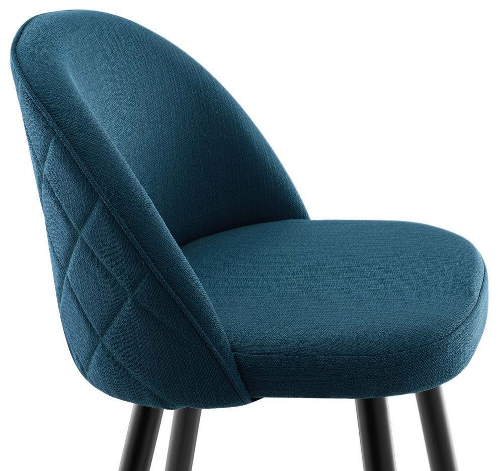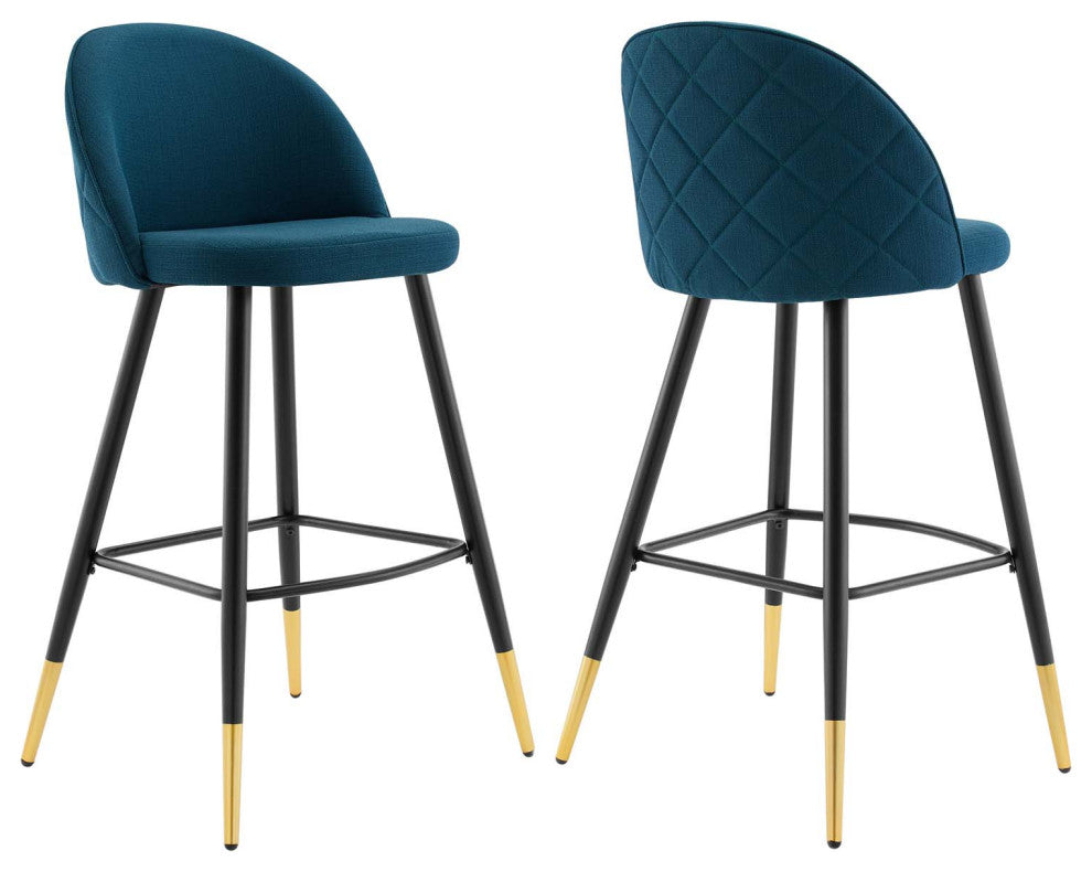 Inspire whimsical dining and functional style with the Cordial Fabric Upholstered Bar Stools- Set of 2. Featuring a rounded silhouette with French piping detail and a diamond lattice pattern along the back, these upholstered bar stools are covered in soft polyester fabric and padded in dense foam to grant supportive comfort while dining or relaxing. A versatile addition to a kitchen counter or bar table, this bar stool set rests atop black metal legs with gold accents and non-marking foot caps. Bar Stool Weight Capacity: 300 lbs.Set Includes:Two - Cordial Fabric Bar StoolRetro Modern Bar StoolsPolyester Fabric UpholsteryMatte Black Metal LegsNon-Marking Foot CapsAssembly RequiredBar Stool Weight Capacity: 300 lbs.Overall Product Dimensions: 19"L x 19"W x 40.5"HSeat Dimensions: 15.5"L x 19"W x 29.5"HBackrest Dimensions: 19"W x 12"HLeg Height: 29.5"HProduct Materials: Seat board 25mmT plywood board, front is glued w/ 3cm foam w/density 20kg/m3, back is glued w/ 1cm foam with density 20kg/m3. 100% polyester, f38/f19• 1.1mm metal legs in black powder coating w/ bottom painted in gold color,w/ black adjustable foot pinsProduct Weight: 16 LbsAssembly Required : YES