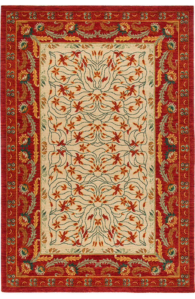Bold and beautiful, the stunning persimmon red of the wide border and smaller flower and vine tendrils placed on a background of ivory, make this a stunning addition to many design settings. This all wool rug with bamboo silk accents is part of the Tibetan Hybrid Collection from Tibetan Rug experts, InnerAsia Rugs. It was made on a mechanized loom with the exacting attention to detail and masterful interplay of color and texture that captures the essence and appeal of Tibetan hand crafted carpets. Designed and created by InnerAsia Rugs China.