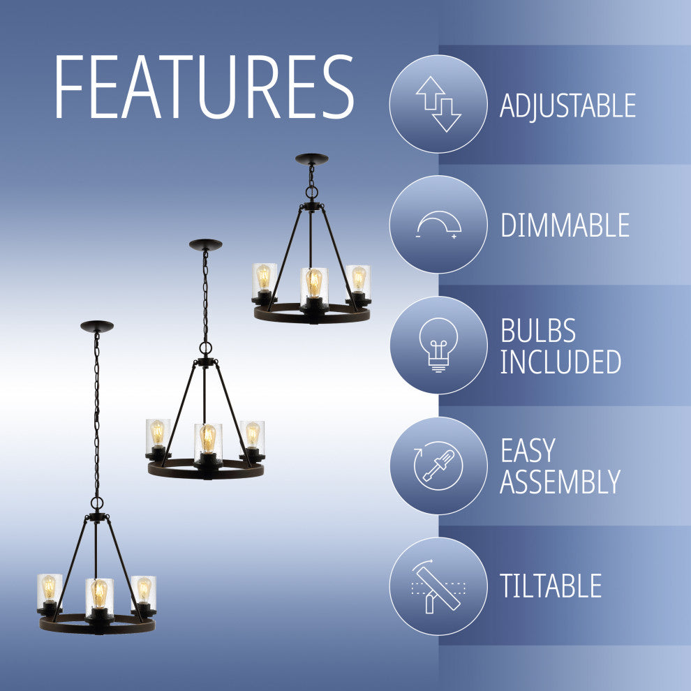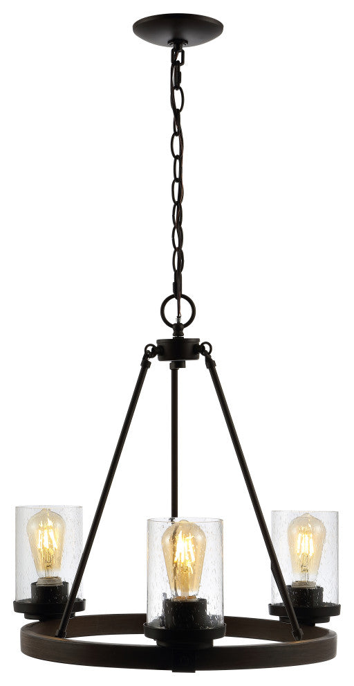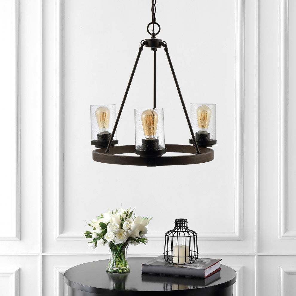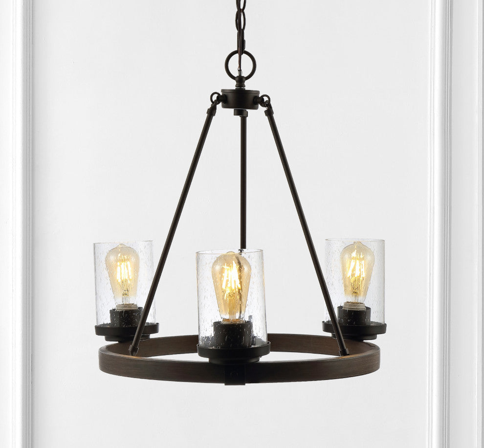 A minimalist aesthetic and rustic barnwood finish make this chandelier both stylish and practical. With clean, modern lines based on an old-world silhouette, this 3-light chandelier''s versatile design is ideal for a modern farmhouse, transitional dining room, or above a rustic table. The black metal candles are accented by clear glass shades.Features:• Replace outdated kitchen or dining room lighting with our unique barnwood and oil rubbed bronze finish for a minimalist-modern farmhouse makeover• Our light fixtures work with LED-compatible dimmers; professional installation is recommended• Takes 4 bulbs and compatible with any 9W LED or 40W TYPE "A" or 13W CFL• Eco-Friendly 4W LED Bulb included• As this fixture must be hardwired, we recommend a professional electrician manage installation• Color: Oil Rubbed Bronze with seeded shade• Body Material: Iron/Glass• Includes: One (1) lamp• Assembly RequiredDimensions:• Lamp: 24-96 inches high x 20 inches wide x 20 inches deepAbout us:You see a lamp.We see a decorative work of art.A perfectly curved shade casts a dramatic shadow on a floor. Compatible with LED lightbulbs: as easy on the environment as they are on the eyes. The JONATHAN Y Lighting collection considers every detail from impeccably sourced materials to designer styling. And our prices are so attractive, we''ve transformed a functional necessity into a fashion accessory.JONATHAN Y Lighting - a fashion revolution in home decor.