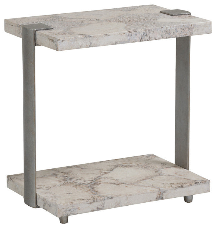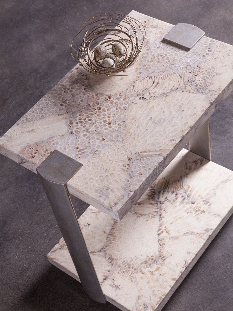 Hand-forged iron base with fossilized coral top and lower shelf.