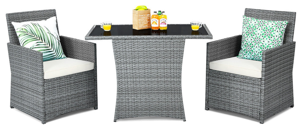 With curved backrests, comfy armrests and soft cushions, this outdoor bistro set provides optimal comfort for outdoor relaxation. Considering the changeable weather, this patio dining set is constructed of anti-rust steel frame and all weather PE rattan. If you accidentally spill a drink on the table or cushions, don''t worry. The smooth tabletop with sturdy tempered glass is easy to clean. And the cushion covers with zipper design can be detachable for easy maintenance. After using it, you are able to store 2 chairs under the table to save your outdoor space.