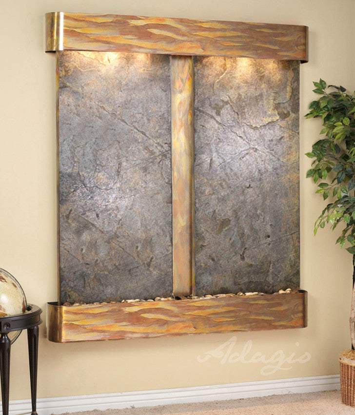 The Cottonwood Falls water fountain is a stunning addition to your home or office. It features two panels of natural slate, marble, mirror, or FeatherStone along with your choice of metal trim finish. The peace and tranquility that the sound of running water brings will calm all those who are fortunate enough to hear it. Full color instructions and the EZ install bracket simplifies hanging this water feature. 61" L x 69" H x 6" D, easy to hang, complete with colored instructions and hardware for hanging on a sheetrock wall. Hanging Weight 180 lbs.This unit includes: 6 halogen lights Polished river rocks Electric pump 3-way pull chain that allows you to run just lights, just water, or lights and water. Welded plastic liner insures against leaking and unique water distribution unit system will not clog. 110V, 100W; one cord operates entire unit; 90 degree plug can be concealed behind water feature. Durable powder coat finish; Manufactured and assembled in the USA with a 1 year limited warranty. • This light-weight slate veneer known as FeatherStone is natural stone and therefore may differ in color and texture from the photos shown.