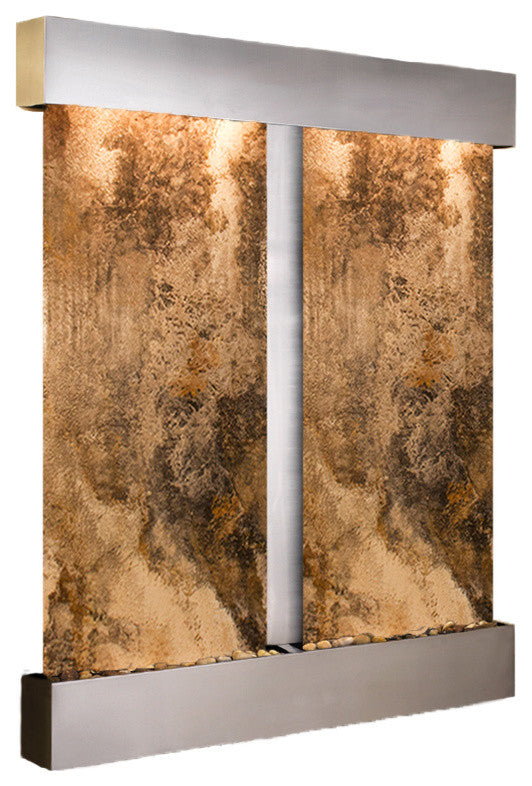 The Cottonwood Falls water fountain is a stunning addition to your home or office. It features two panels of natural slate, marble, mirror, or FeatherStone along with your choice of metal trim finish. The peace and tranquility that the sound of running water brings will calm all those who are fortunate enough to hear it. Full color instructions and the EZ install bracket simplifies hanging this water feature.61" L x 69" H x 6" D, easy to hang, complete with colored instructions and hardware for hanging on a sheetrock wall. Hanging Weight 490 lbs.This unit includes: 6 halogen lights Polished river rocks Electric pump 3-way pull chain that allows you to run just lights, just water, or lights and water. Welded plastic liner insures against leaking and unique water distribution unit system will not clog. 110V, 100W; one cord operates entire unit; 90 degree plug can be concealed behind water feature. Durable powder coat finish; Manufactured and assembled in the USA with a 1 year limited warranty. • All travertine are natural and may differ in color and texture from the picture shown due to their natural uniqueness.