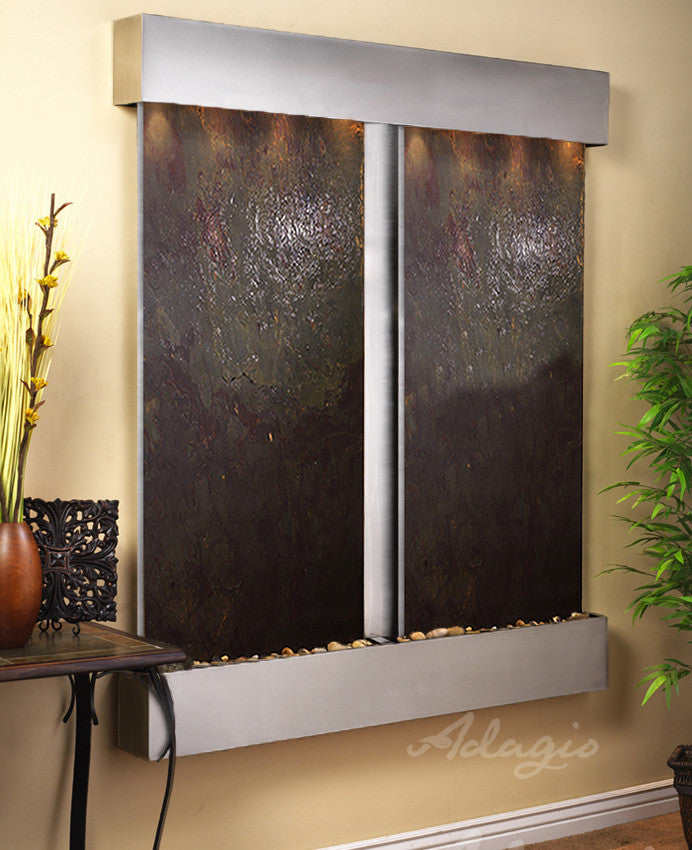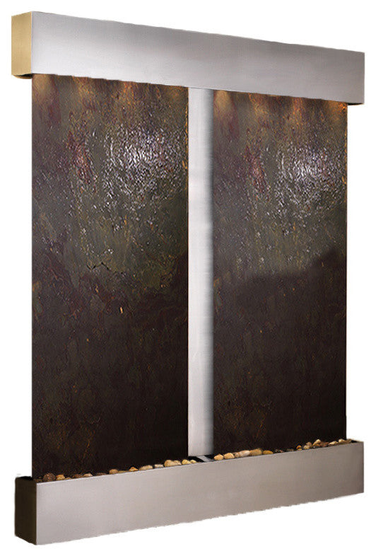 The Cottonwood Falls water fountain is a stunning addition to your home or office. It features two panels of natural slate, marble, mirror, or FeatherStone along with your choice of metal trim finish. The peace and tranquility that the sound of running water brings will calm all those who are fortunate enough to hear it. Full color instructions and the EZ install bracket simplifies hanging this water feature.61" L x 69" H x 6" D, easy to hang, complete with colored instructions and hardware for hanging on a sheetrock wall. Hanging Weight 180 lbs.This unit includes: 6 halogen lights Polished river rocks Electric pump 3-way pull chain that allows you to run just lights, just water, or lights and water. Welded plastic liner insures against leaking and unique water distribution unit system will not clog. 110V, 100W; one cord operates entire unit; 90 degree plug can be concealed behind water feature. Durable powder coat finish; Manufactured and assembled in the USA with a 1 year limited warranty. • This light-weight slate veneer known as FeatherStone is natural stone and therefore may differ in color and texture from the photos shown.