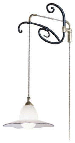More about the country line collection: the country line is derived from the 20th century italian artisan movement and is distinguished by its particular design that inspires lightness and essentiality. Several of the lighting fixtures have a counter balance weight which enables for easy height adjustment. While the overall tone of this collection is similar to that of the country green, the ornate ironwork and gentle shade provide for a more classical look. The glass shades can illuminate rooms of any size and the unique arms on these pieces will make them the highlight of your home. Items in this collection include four chandeliers, one pull-down chandelier, seven wall sconces, five pendants, three pull-down pendants, two floor lamps/torchiere, two table lamps and two ceiling mounts. Finishes include black (graphite) with silver leaf details and rust with weathered brass (verdigris) details. Venetian glass options include satin straw (20), satin white with brick-red details (40), satin white with blue details (50) and White Scavo (90).