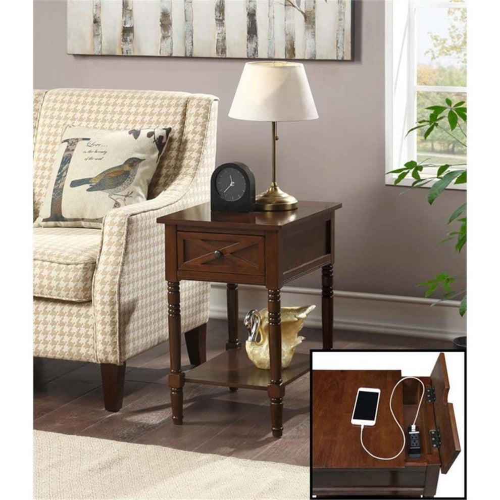 Bring the style and functionality of the Country Oxford End Table with Charging Station, home today! Featuring a concealed built-in charging station for easy accessibility. The charging station includes two standard outlets and two USB ports which can easily charge your phone, tablet and even your laptop. The cable management hole allows you to store multiple devices on the tabletop without the damaging or tangling of cords. Features a drawer for additional concealed storage and includes a bottom shelf great for books or displays.Features: • Part of the Country Oxford Collection • 2 Standard Plug Outlets & 2 USB Ports • Beautiful Espresso Wood Finish • Quick and Easy Set Up • (L) 16 in. x (W) 20 in. x (H) 25 in. • Fits any decor, especially farmhouseSpecifications: • Product Dimensions: (L) 16 in. x (W) 20 in. x (H) 25 in. • Product Weight: 25