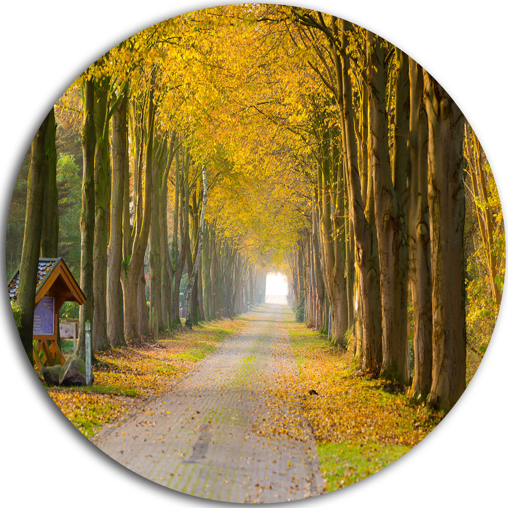 Bring Contemporary Abstraction to your home with this large Circle Metal wall art. This Country Road Below Yellow Trees Metal Artwork makes it the focal point of any room or office.
