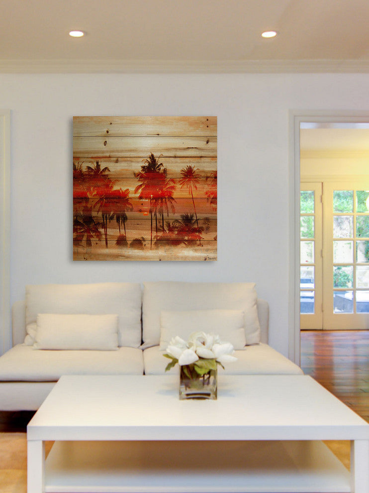 "Crimson Palms" Print on Natural Pine Wood, 24"x24"