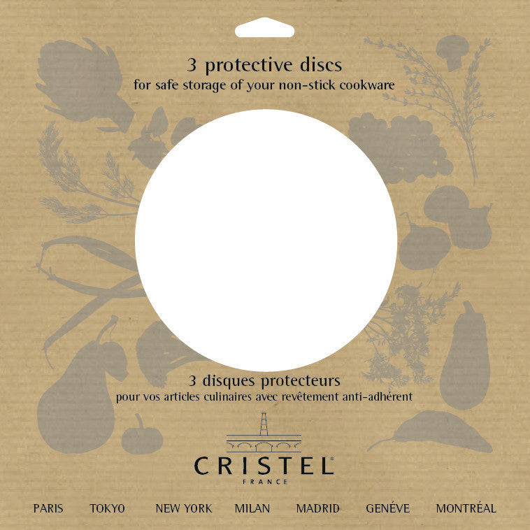 Protect your investment with the Cristel Cookware Protection Pads. A simple solution for protecting the surface of your non-stick frying pans, the Cristel Cookware Protection Pads recduce scratching of stacked Cristel non-stick cookware. Sold as a set of three, these soft touch discs measure nine and a half inches and prove especially handy when stacking multiple pans in tight storage spaces. Washable.