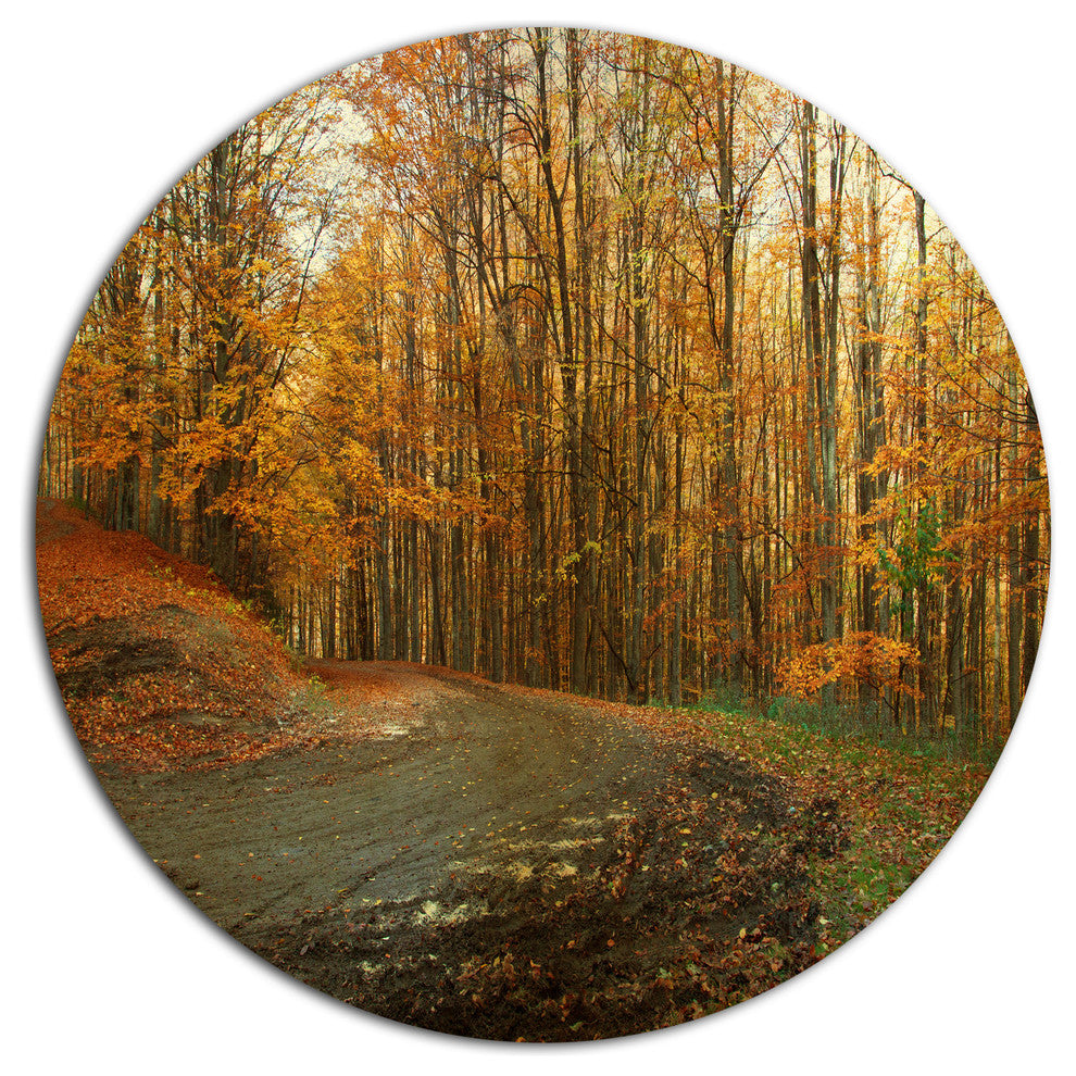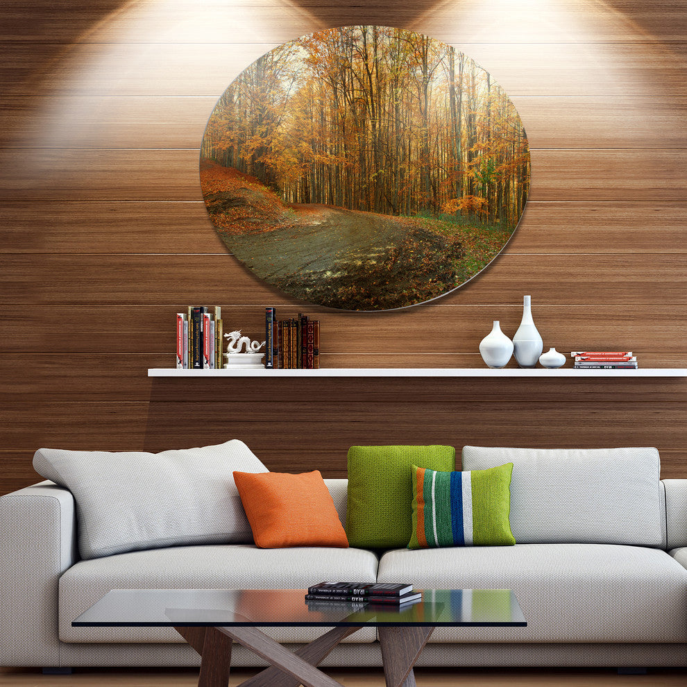 Bring Contemporary Abstraction to your home with this large Circle Metal wall art. This Curving Road in Autumn Forest Metal Artwork makes it the focal point of any room or office.