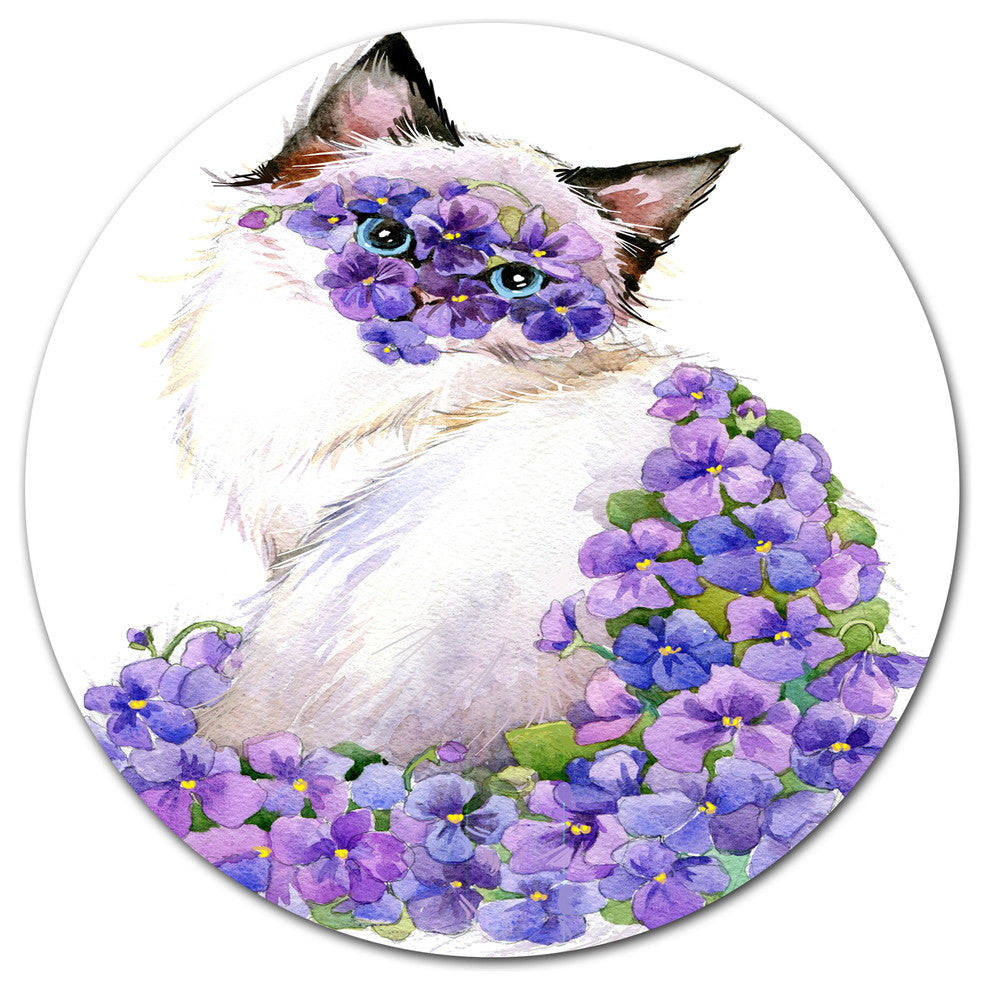 Cute Cat With Blue Flowers, Animal Disc Metal Artwork, 23"
