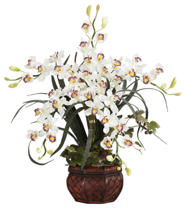 Cymbidium With Decorative Vase Silk Arrangement, White