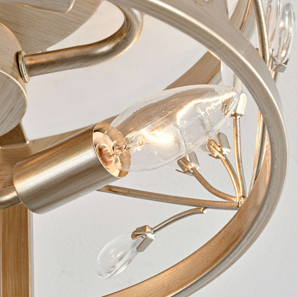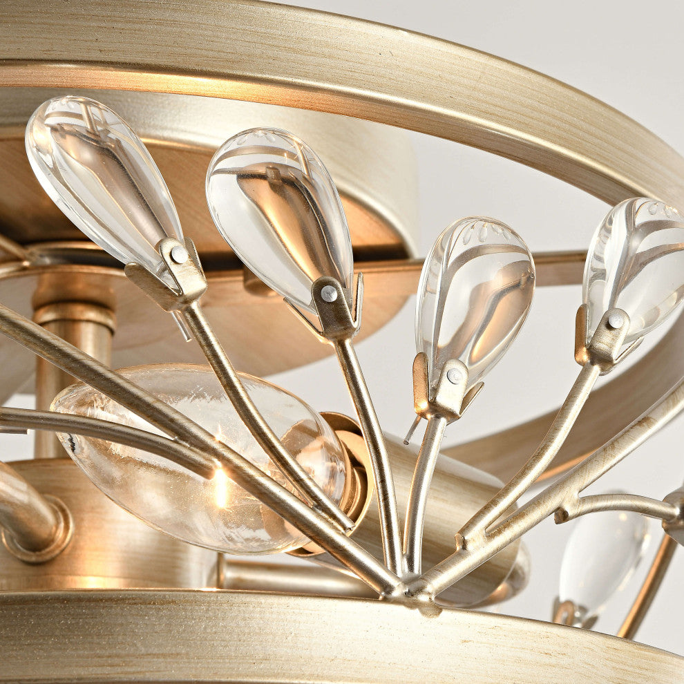 Fixture finish: Sophisticated brushed champagne color theme, with spray-painted matte finish. Depending on the ambient light, it may reveal hints of silver, subtle bronze or light brushed gold. Check pictures showing color details for further reference. Crystal: clear.