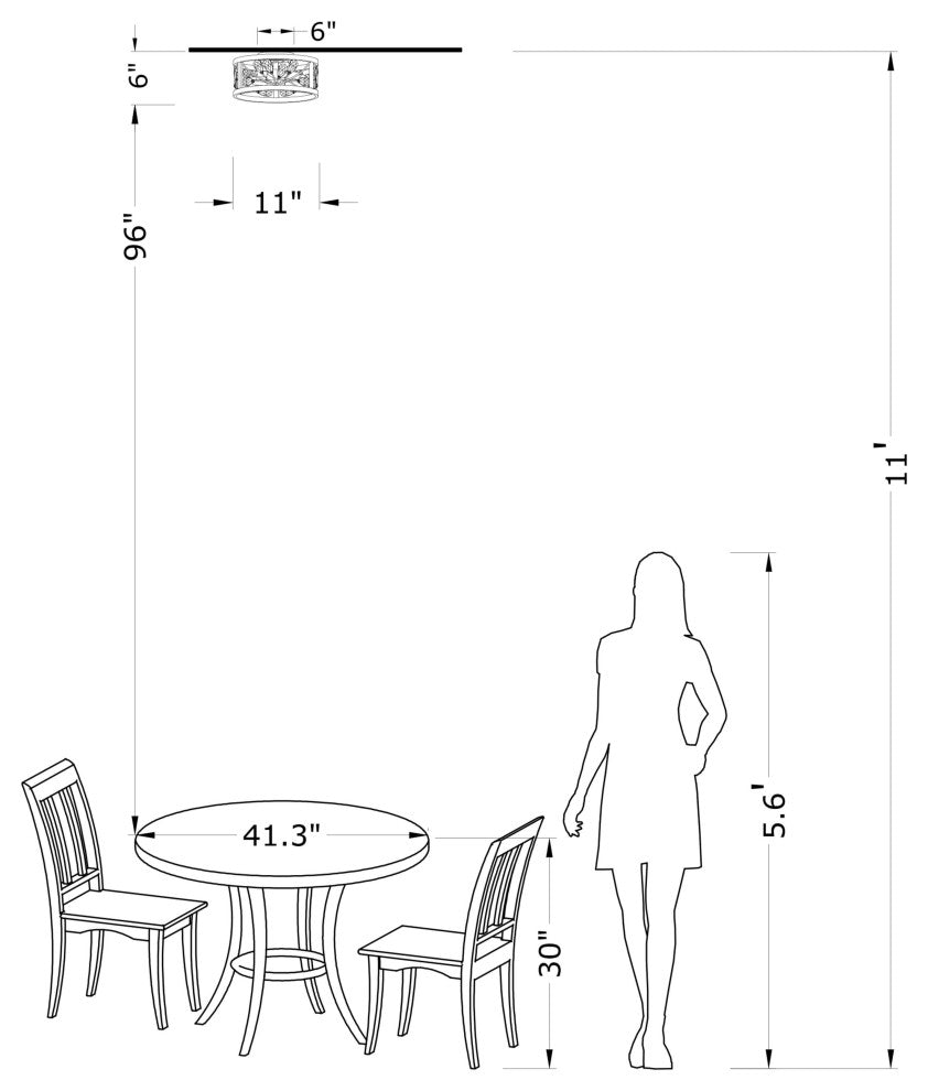 Fixture: 11 inches in diameter x 6 inches H; Ceiling plate: 6 inches in diameter x 1 inch H.