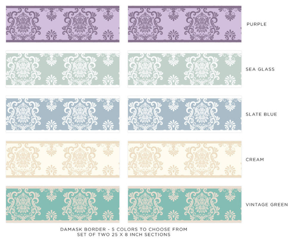 Our damask wall border fabric wall decals will add an awesome design element to any room whether you''re looking to accent one wall or wrap it around the whole room. Each set comes with two 25" x 8" sections that can be joined together to form a continuous line. They are made from a high quality fabric material that is reusable and repositionable so they are super easy to apply. IMPORTANT - PLEASE READ: This is for 2 sections only measuring 25 inches wide each. Please measure your wall or room in order to make sure that you order enough sets. Available in 6 color options 1) Black and White 2) Purple 3) Sea Glass 4) Cream 5) Slate Blue 6) Vintage Green Product Dimensions: (width x height) 2 Sections: 25" wide x 8" tall (each) STILL NOT CONVINCED WHY FABRIC WALL DECALS ARE SUPERIOR TO VINYL? The material for our fabric wall decals is many times more expensive than vinyl but it''s worth the extra cost. It''s made of natural fibers and a water based adhesive so it won''t damage your walls and can be repositioned many times. It''s extremely easy to install because it doesn''t come in a complicated puzzle and you don''t need any tools or diagrams. It won''t shrink or curl like vinyl and the matte finish looks like a mural has been painted on your walls. We have the most competitively priced fabric wall decals that you can find online. Our quality is unmatched and we hope that you love our designs as much as we do!High quality fabric material with a water based adhesive, this is not cheap vinyl like most of the decals you find onlineProudly made in the USA - Non-toxic, Phthalates free, BPA free, PVC freeReusable, repositionable, material will not shrink, stretch, or curl. Our fabric decals will work on most surfaces including textured wallsProduct Dimensions: 2 Sections: 25 Inches wide x 8 Inches tall (each). Easy to apply with no special tools or transfer paper required. Can be pulled apart if it folds over during installation.