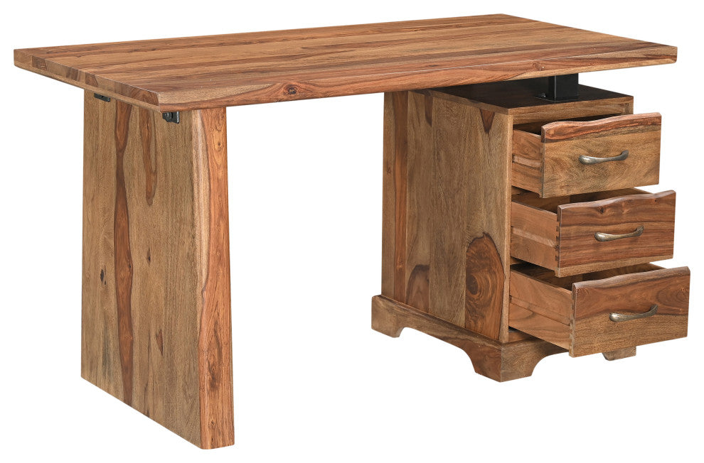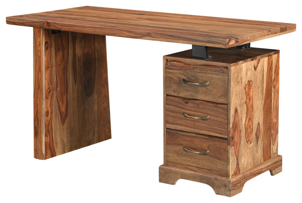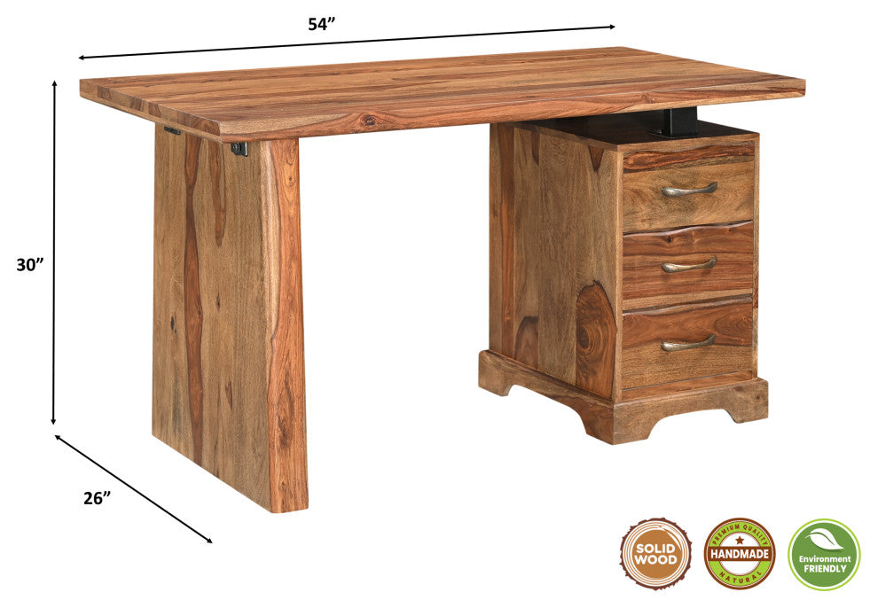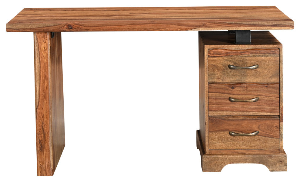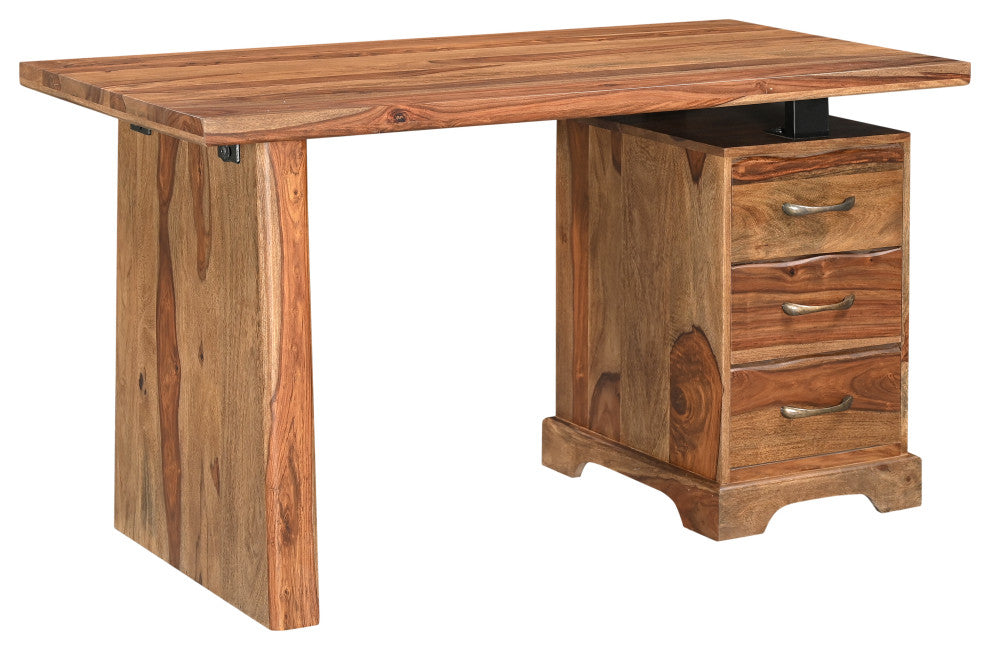 Elevate your home office with this desk set, boasting live edge wood movement and a rich finish. Both the desk and filing cabinet feature three live edge wood drawers, providing plenty of storage space for your items. Crafted from solid sheesham wood, these pieces offer stability and durability for years to come. The infusion of nature-inspired style adds a touch of elegance to your workspace.