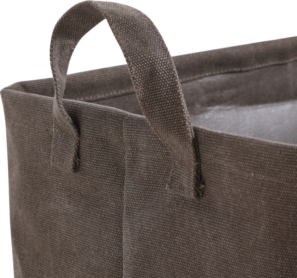 The Danya B Army Canvas Laundry Basket is the perfect size to have in the corner of your bedroom or bathroom. Giving your home a rustic edge, the brown army color canvas is stenciled and easily fits into any color scheme. The convenient handles make for easy transporting for loads of any size. The plasticized interior provides extra protection and durability and is perfect for heavy-duty or wet laundry, such as gym clothes or bathing suits and towels. Folding completely flat for easy storage, the Army Canvas Laundry Basket is a convenient must have for your bathroom or bedroom.