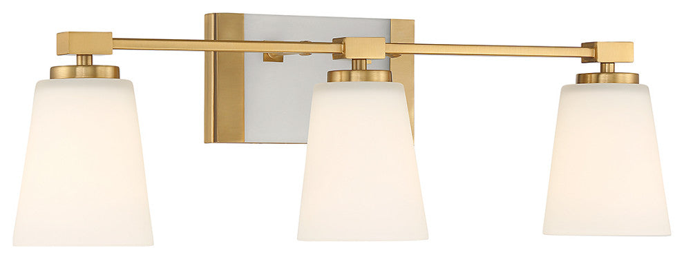 Add a relaxing spa feeling to any bathroom with the Savoy House Darby 3-light bath vanity light! White glass shades offer up a soft yet flattering glow while a matching pane of white glass creates a serene floating effect. Finished in warm brass. Darby is 8" in height, 25.25" in width and extends 7" from the wall. Uses three standard size bulbs of up to 60 watts per bulb (bulbs not included).