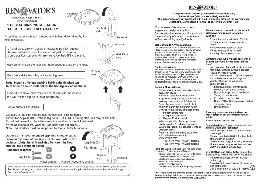 LARGE DARBYSHIRE WHITE GRADE A PORCELAIN PEDESTAL SINK WITH CENTERSET FAUCET HOLESThe Classic White Darbyshire pedestal sink from Renovators Supply Manufacturing features a luxurious wide top and bold design.FEATURES- This Traditional sink is a wide-top pedestal sink.- Constructed from gorgeous Grade A vitreous china porcelain for durability and easy cleanup.- Reno-Gloss finish protects from scratches and stains.- Authentic Renovators Supply Manufacturing logo guarantees better quality than the knockoffs.- This bathroom pedestal sink is cUPC and ANSI Compliant- Freestanding installation style.- Convenient, large sinks and traditional bathroom design inspiration.DIMENSIONS- OVERALL: 32 In. Tall x 34 In. Wide x 22.5 In. Proj.- BASIN HOLE: 17.34 In. Wide x 13 3/8 In. Proj.- LEG: 23.84 In. Tall x 10 In. WideHARDWARE- Accepts 4" Centerset faucet (not included). - 1-3/4 In. drain hole (not included).PACK INCLUDES- One (1) Classic Darbyshire Porcelain Sink and Pedestal LegBUILT WITH LOVERenovators Supply Manufacturing Darbyshire White Wall Mounted Pedestal Sink is a mix of modern and traditional looks that brings a unique flair to any bathroom setting. All of these are carefully wrapped and packed separately to avoid any scratches during the transition - Buy with confidence!