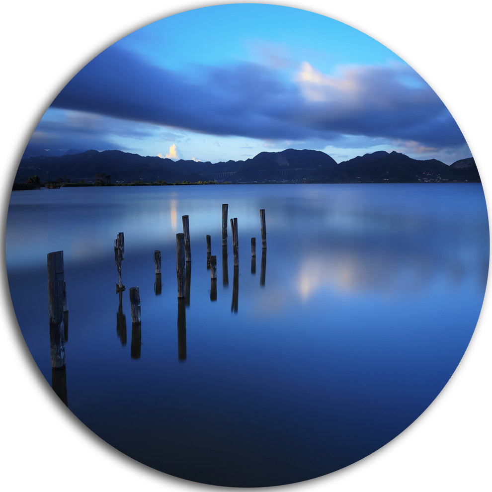 Bring Contemporary Abstraction to your home with this large Circle Metal wall art. This Dark Blue Sea with Pier Remains Metal Artwork makes it the focal point of any room or office.
