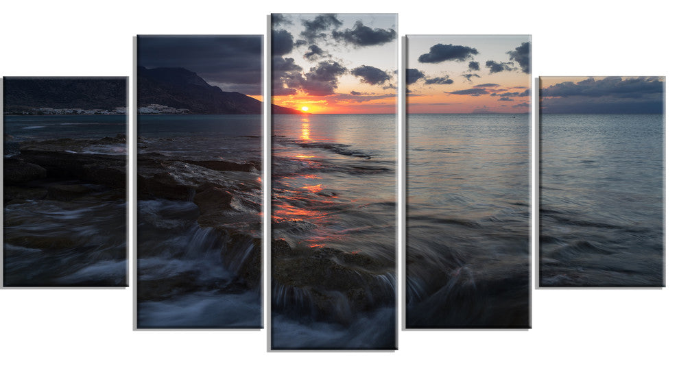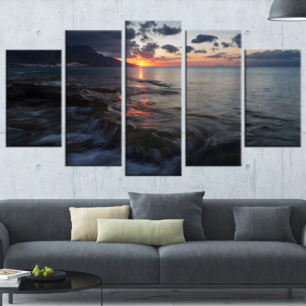 "Dark Mediterranean Beach Dawn" Modern Seashore Canvas Art, 5 Panels, 60"x32"