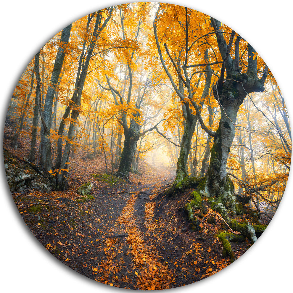 Dark Yellow Old Forest In Fog, Landscape Photo Round Metal Artwork, 38"
