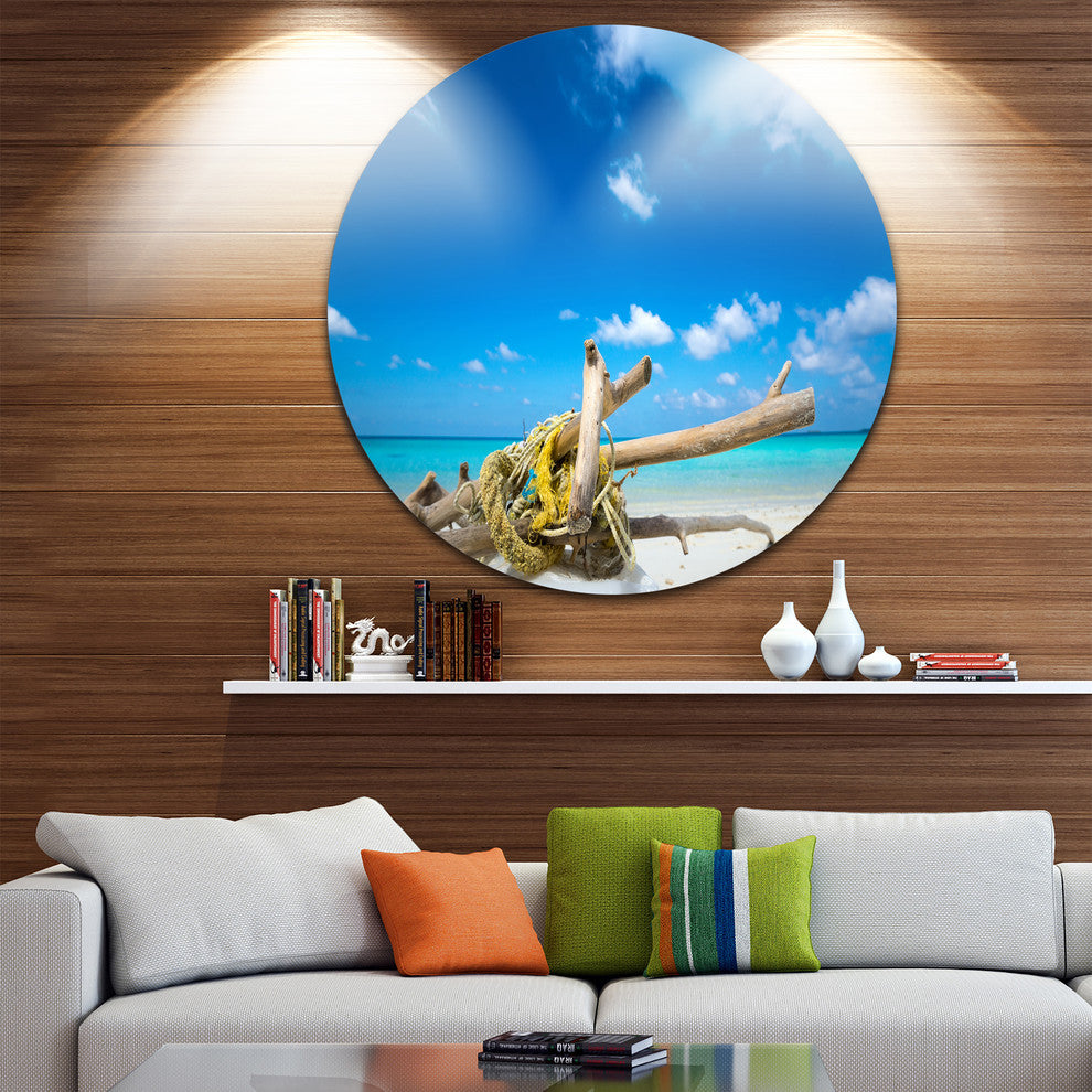 Deadwood On White Sand Beach, Contemporary Seascape Round Wall Art, 23"