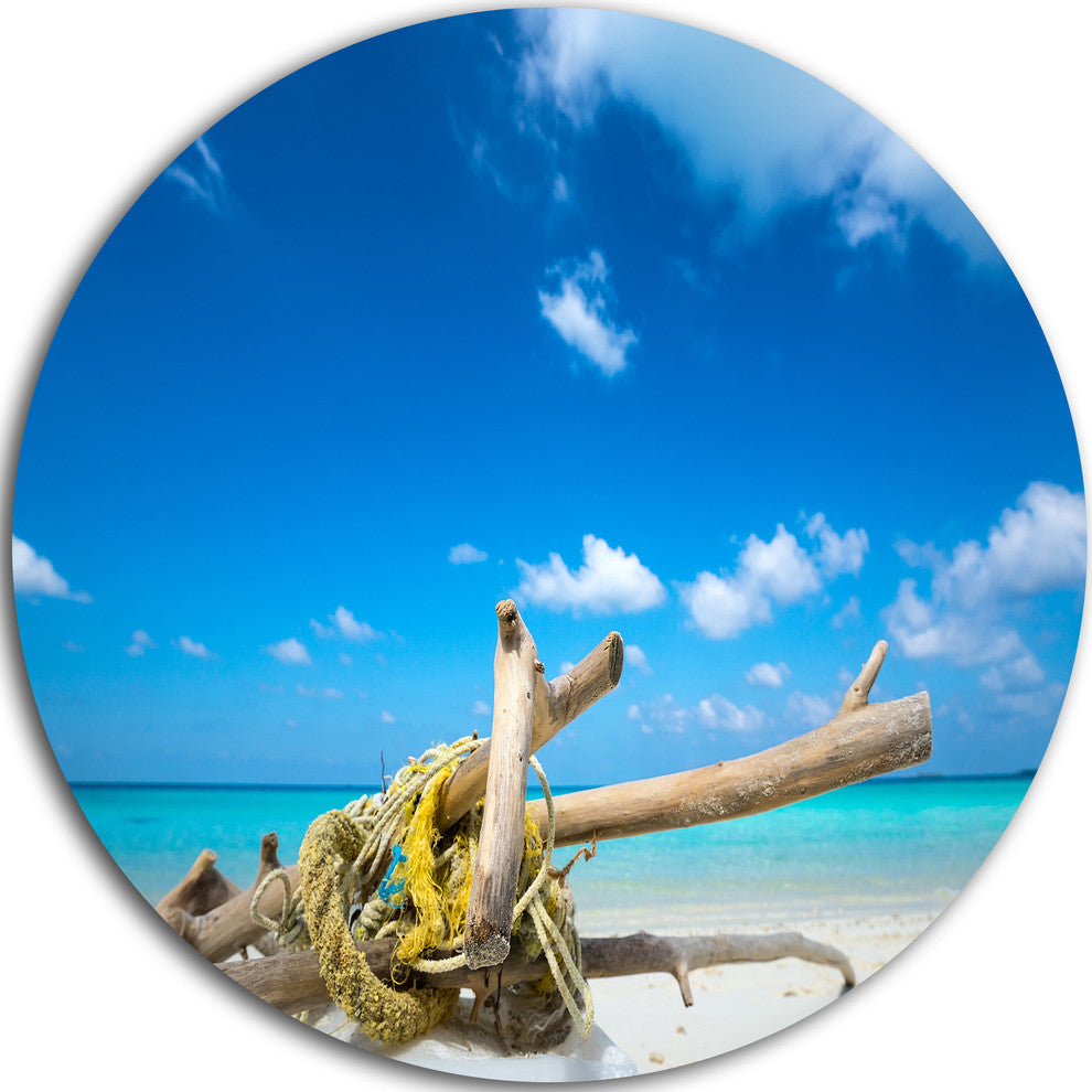 Deadwood On White Sand Beach, Contemporary Seascape Round Wall Art, 36"