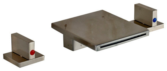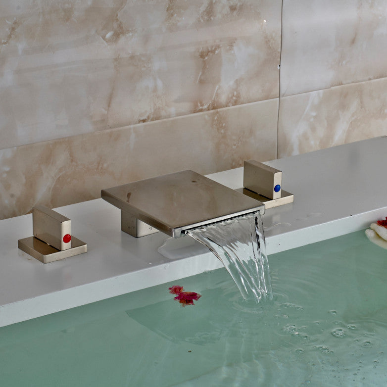 Brushed bathroom sink faucet three handle deck mount waterfallFontana''s deck mount brushed nickelbathroom sink faucet is an elegant waterfall style faucet that can nicelycomplement any contemporary bathroom. It is dual handle with 4 minispreadfaucet mount. The valve core material is ceramic, which guarantees a longlasting lifetime. It comes complete with accessories and installationinstructions. Specification: - Style: Contemporary- Hot & Cold Water: Yes- Number of Handles: Dual Handle- Surface Treatment: Brushed Nickel - Style: Dual Holder Three-hole- Faucet Mount: 4" Mini spread- Type: Ceramic Plate Spool- Valve Core Material: Ceramic- Installation Type: Deck Mounted- Spout Length: 11cm (4. 3")- Spout Width: 13. 4cm (5. 2")-Flow Rate: Maximum 1.8 GPM-Aerator Included: Minimum .5 GPM