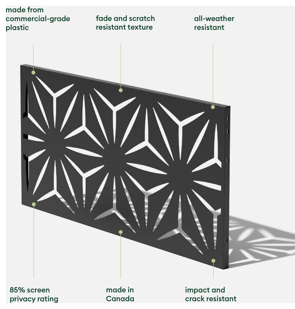 Whether it''s your room, your patio or your fence, the Veradek Screen Series with its perfect balance of design, durability and convenience features a modern geometric design which is the perfect fit to create privacy, be used as a separator or fill out an empty space. The panels are made from a durable plastic, making it impact, crack and scratch resistant. All Veradek products are extreme weather tested, so you can rest assured that your privacy screen can withstand the harshest conditions. The screen panel comes in seven designs ranging in privacy levels that pair well in any outdoor space.