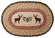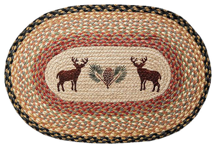 Deer/Pinecone Oval Rug 20"x30". Made in Bangladesh from 100% Natural Jute which is Biodegradeable & Eco-Friendly. Jute is also one of the strongest fibers known to man. Clean with mild soap and cold water. Do not machine wash. Design is Hand Stenciled.