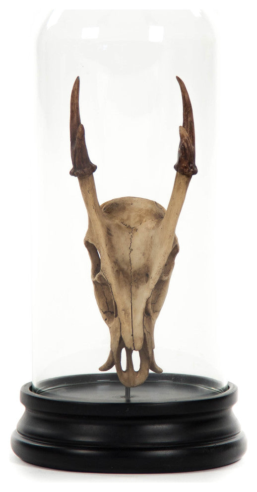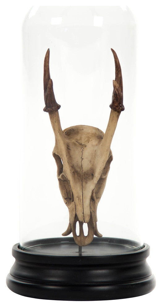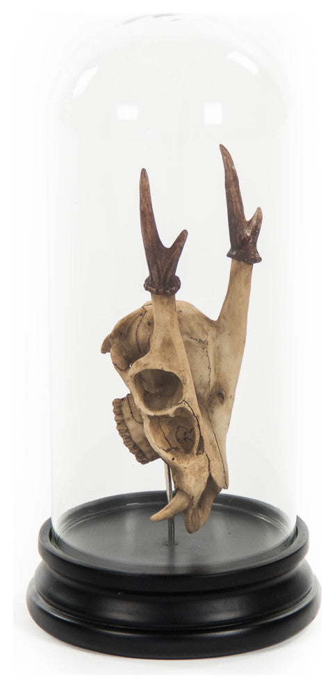 Decorate a console table or bookcase with the unique Deer Skull Statue With Cover. Made from distressed white polyresin, this fake skull is eye-catching and unique. It comes displayed in a clear glass bell jar.