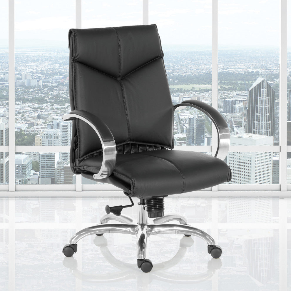Deluxe Mid Back Black Executive Leather Office ChairBring a well designed professional appearance to any office with our Deluxe Executive Leather Mid-Back Chair. This Pro-Line II® chair features contour seat and back with built-In lumbar support, one touch pneumatic seat height adjustment. Locking mid pivot knee tilt control with adjustable tilt tension. Other features include soft padded chrome arms and black Top Grain Leather on all seating surfaces. Complete with heavy duty chrome base with dual wheel carpet casters and is GreenGuard indoor Air Quality Certified and backed by a limited lifetime warranty.Features: • Contour Seat and Back with Built-in Lumbar Support • One Touch Pneumatic Seat Height Adjustment • Locking Mid Pivot Knee Tilt Control with Adjustable Tilt Tension • Top Grain Leather • Padded Polished Aluminum Arms • Chrome Finished Base with Dual Wheel Carpet Casters • Arms to Floor Height: 26.13" - 28.75" • Arms to Seat Height: 7.75: - 7.75" • For commercial useSpecifications: • Chair Dimensions: 24.75"W x 26.75"D x 41.5"H • Chair Weight: 46 lbs • Chair Weight Capacity: 275 lbs • Seat Dimensions: 20.38"W x 18.75"D x 4"T • Seat Height: 18.06" - 20.39" • Back Dimensions: 18.88"W x 20.38"H x 4"T