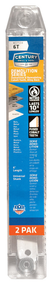 Reciprocating Saw Blade Demolition Cobalt Bi-Metal 6T X 6" 5 Pack. Width 7/8", Thickness 0.062". Application: Fast Plunge Cuts In Wood, Nail Embedded Wood Plaster And Aluminum. Extra Thick, Extra Wide Blade For All Types Of Hard To Cut Demolition Work.