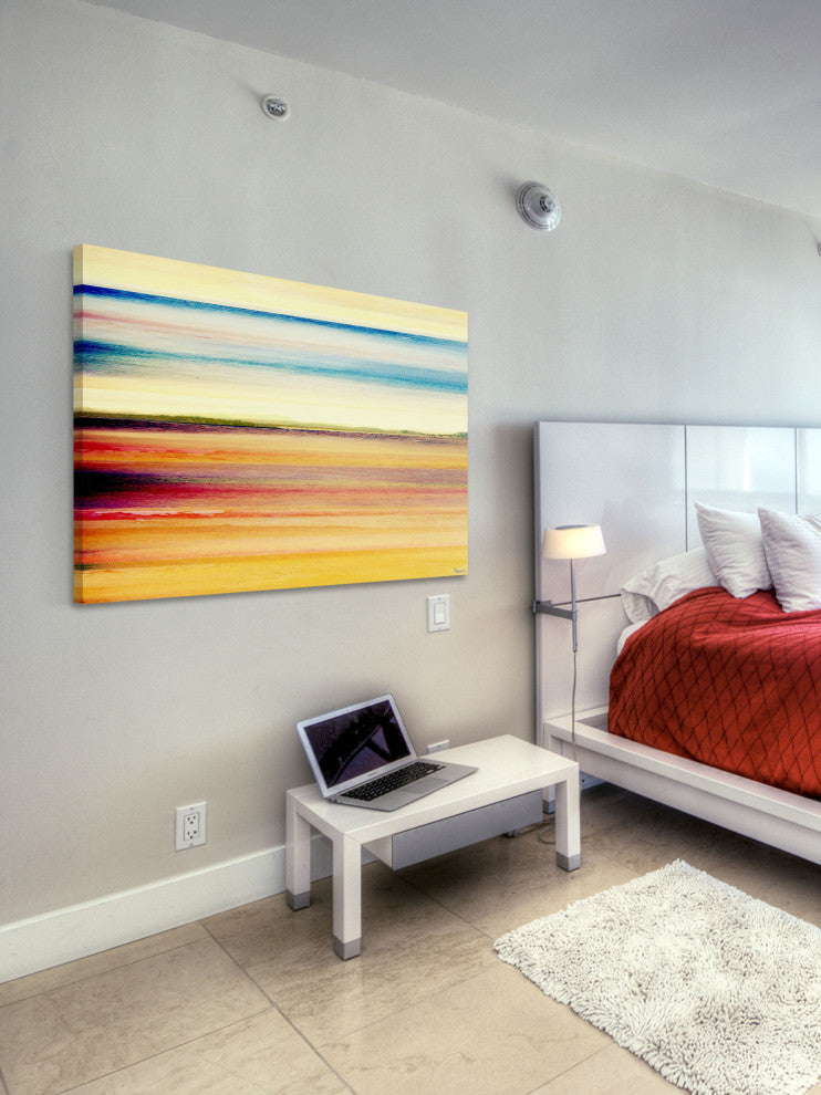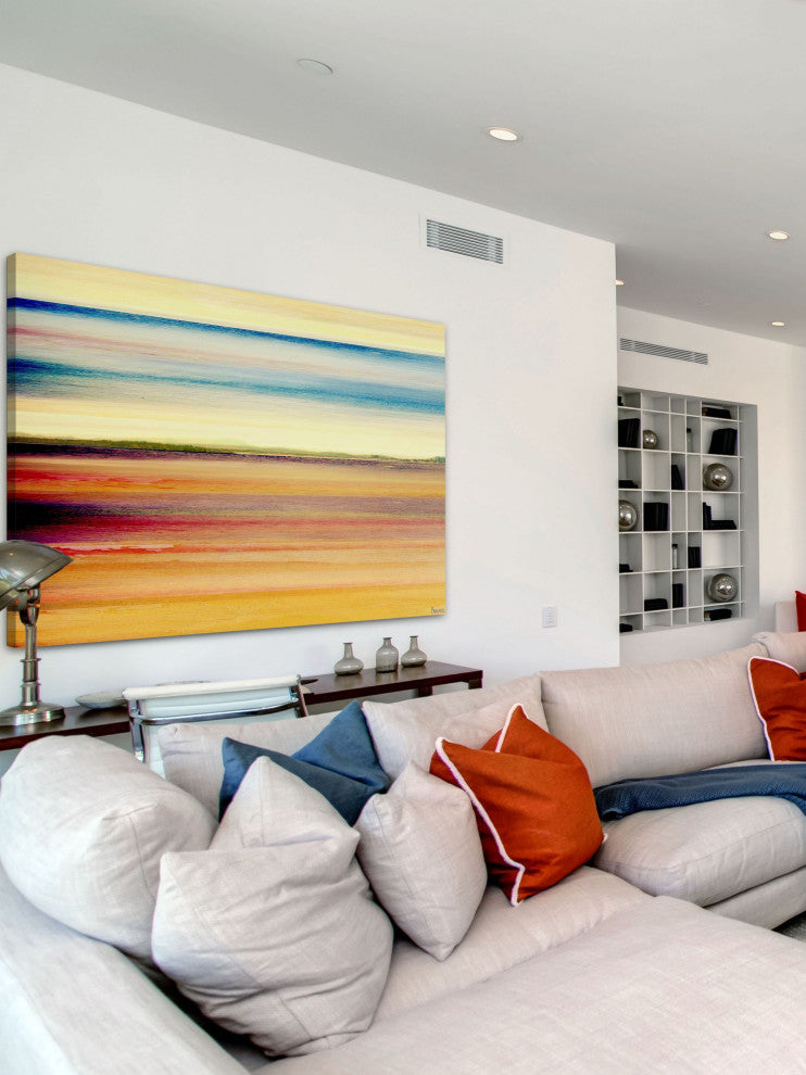 Striking and unique, the "Desert Colors" Print on Canvas by Parvez Taj will bring your walls to life. Printed on canvas, this 45 inch wide by 30 inch tall contemporary artwork will make a statement in any living room, dining room, or bedroom.- Fine art canvas print by Parvez Taj- Professionally hand stretched- Gallery wrapped in sustainable, non-warping wood- Arrives ready to hang- Made in the USA- Includes a certificate of authenticity- Artist signature on the front