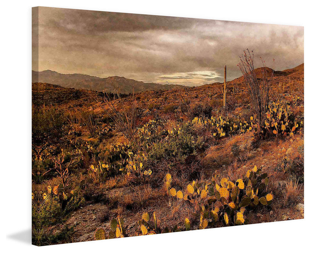 "Desert Sunset" Painting Print on Canvas by Robertson features vivid tones and supple artistry. Printed on canvas, this 30 inch wide by 20 inch tall piece will be an exceptional addition to any room. Fine art canvas print from the Marmont Hill Art CollectiveProfessionally hand stretchedGallery wrapped in sustainable, non-warping woodArrives ready to hangMade in the USAIncludes a certificate of authenticity
