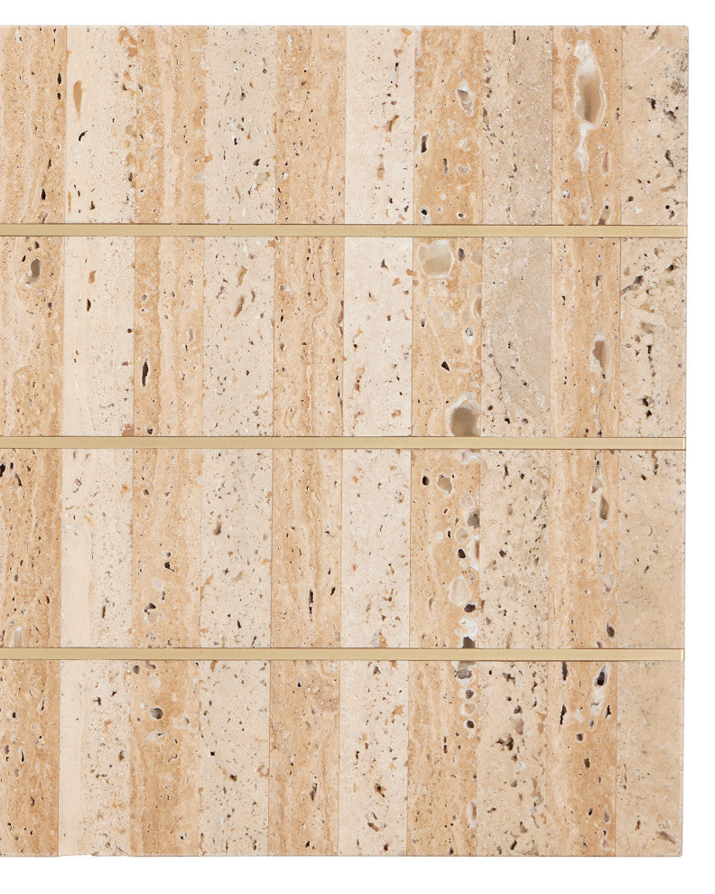 The Dezi Console Table has a top set with natural travertine tiles arranged in a stacked dark-and-light pattern with lines of brass inlay running throughout. The effect of the intermingling of materials is a pop of brightness as the natural light shines on the metal and a hint of warmth as the stone absorbs it. The top on the gold console table is supported by clean-lined legs that are made of iron and connected by an x-shaped stretcher.