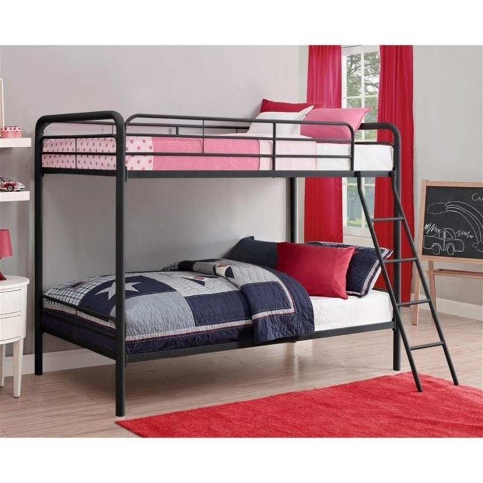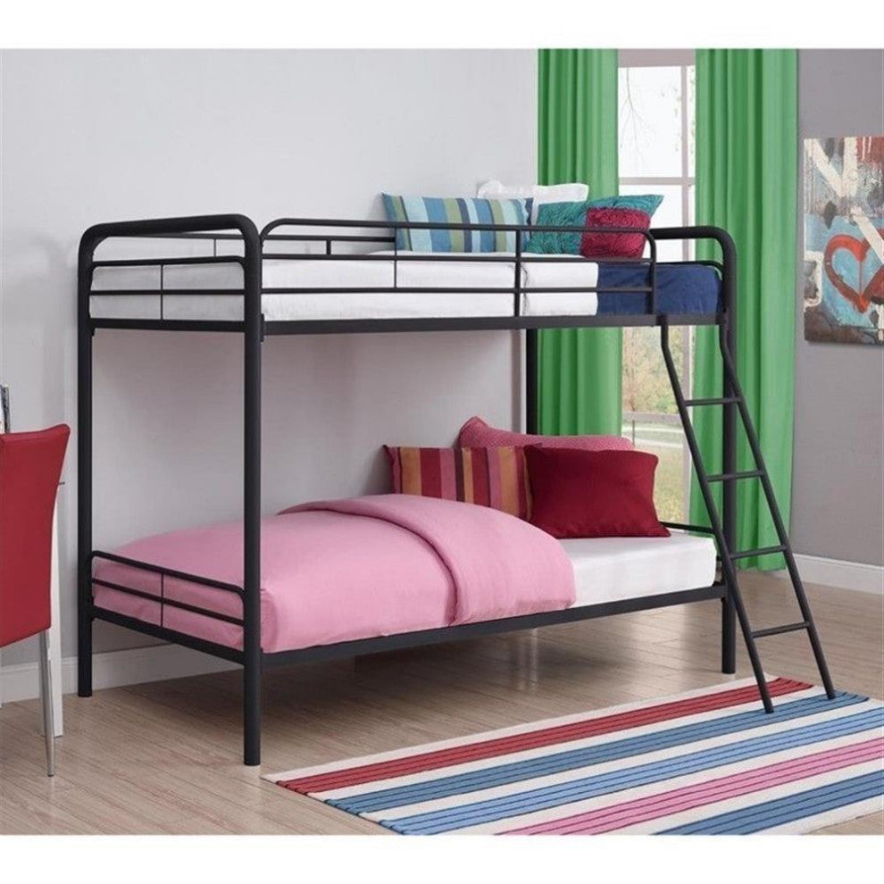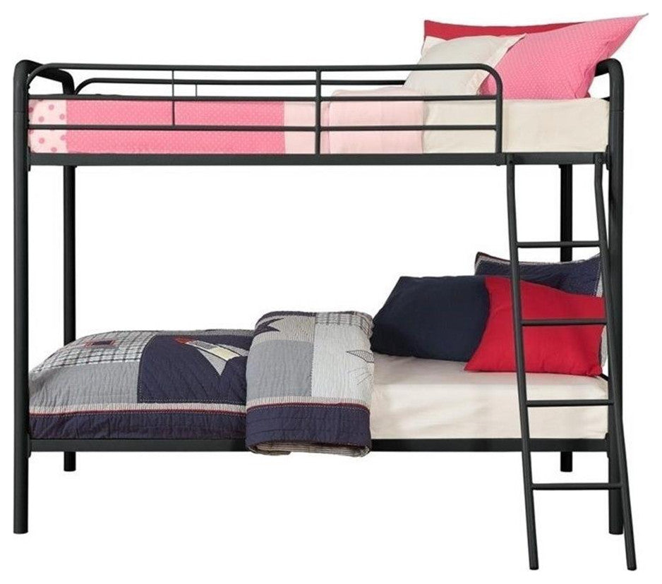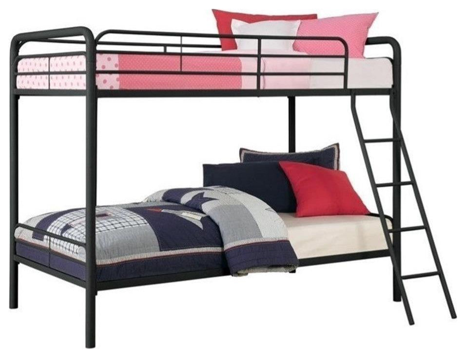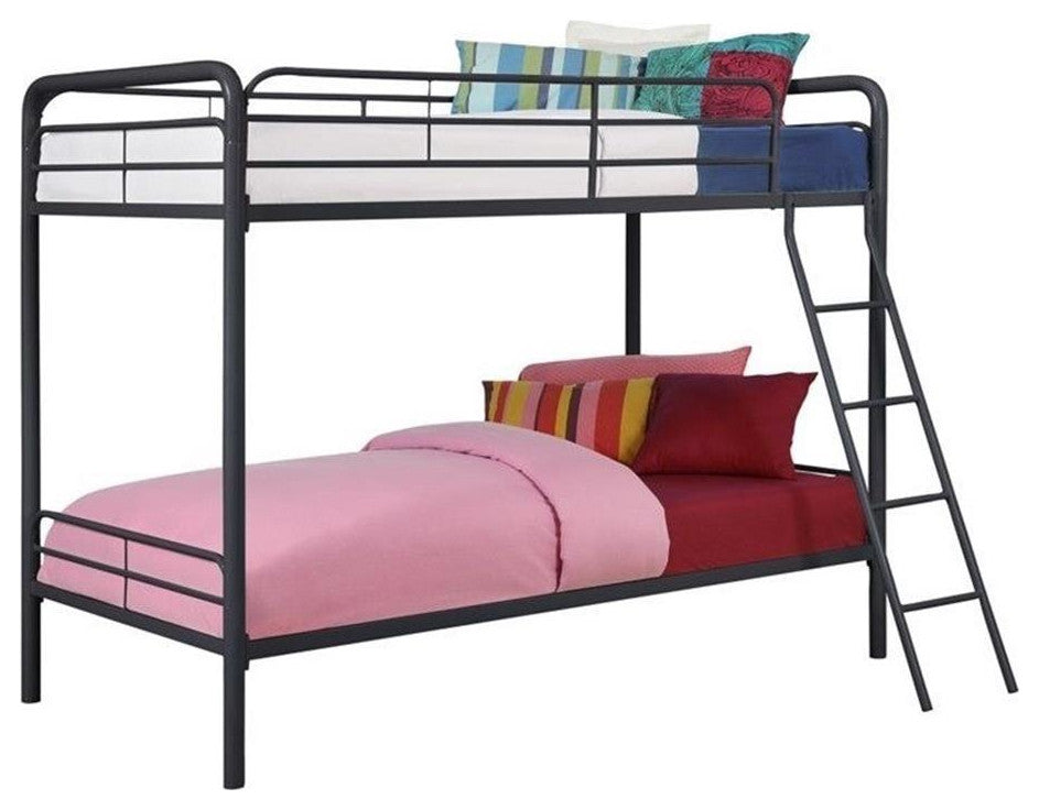 Simple, sleek, secure, stable and space-saving, DHP''s Twin-Over-Twin Metal Bunk Bed meets all your needs and expectations. Easy to assemble, the bunk bed has been designed for the utmost safety, providing full-length guardrails and a ladder that attaches to the frame. Accommodating two twin mattresses, the black metal frame will last through years of rough play, whether hosting twins, friends, family or siblings.Features: • Black metal finish • Top Bunk Weight Capacity: 200 lbs • Designed to maximize space - accommodates 2 standard twin mattresses • Bottom Bunk Weight Capacity: 225 lbs • Front ladder attaches to the bed for and full-length guardrails on upper bunk for added safety • Mattresses not includedSpecifications: • Product Dimensions: 61.5" H x 78" W x 41.5" D • Product Weight: 83.5 lbs