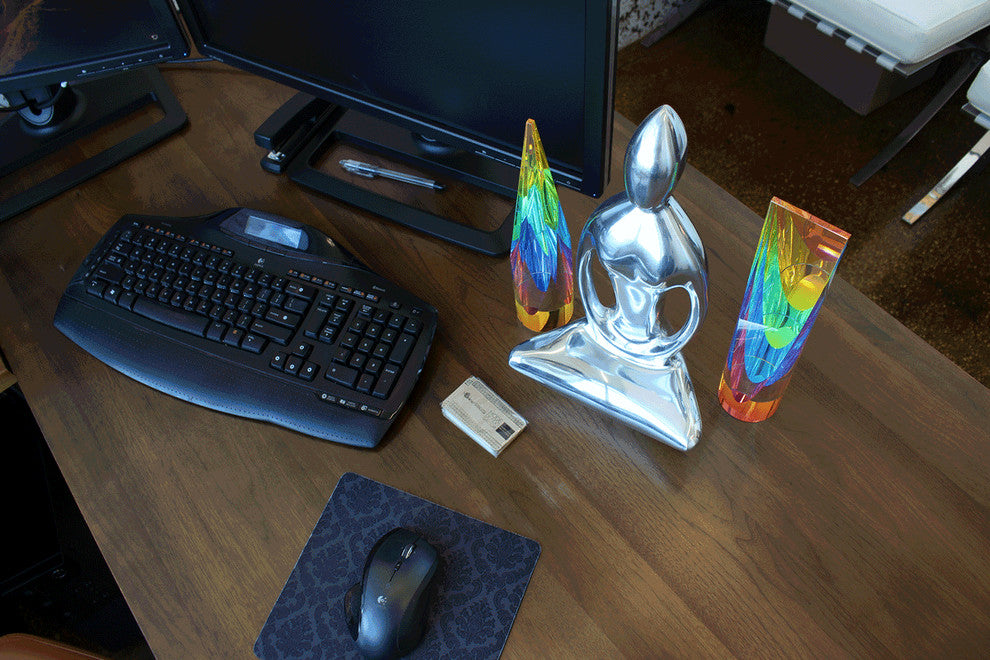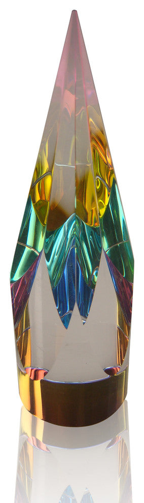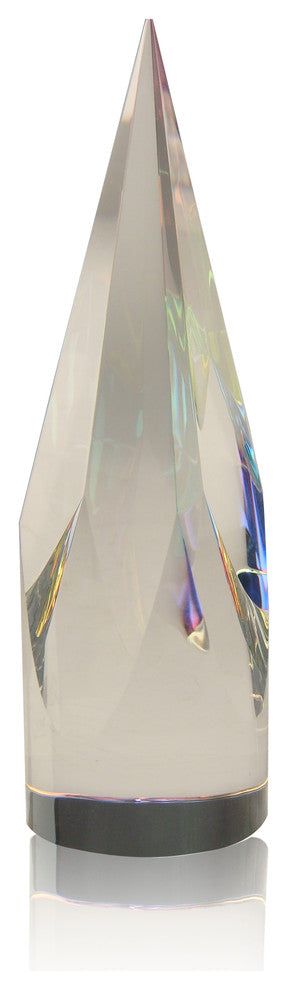 These alluringly carved crystals have a secret - a dichroic coating on the bottom scatters colored light into the crystal. From a front or underneath perspective there is no color, but when viewed from an angle down the light bouncing off the bottom is prismatic in color variation based on the viewing angle and can have quite spellbinding rainbows that change in color as you move your head around to peer at it.