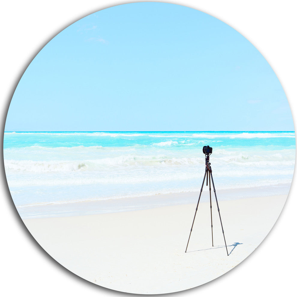 Bring Contemporary Abstraction to your home with this large Circle Metal wall art. This Digital Camera and Tripod on Beach Metal Artwork makes it the focal point of any room or office.