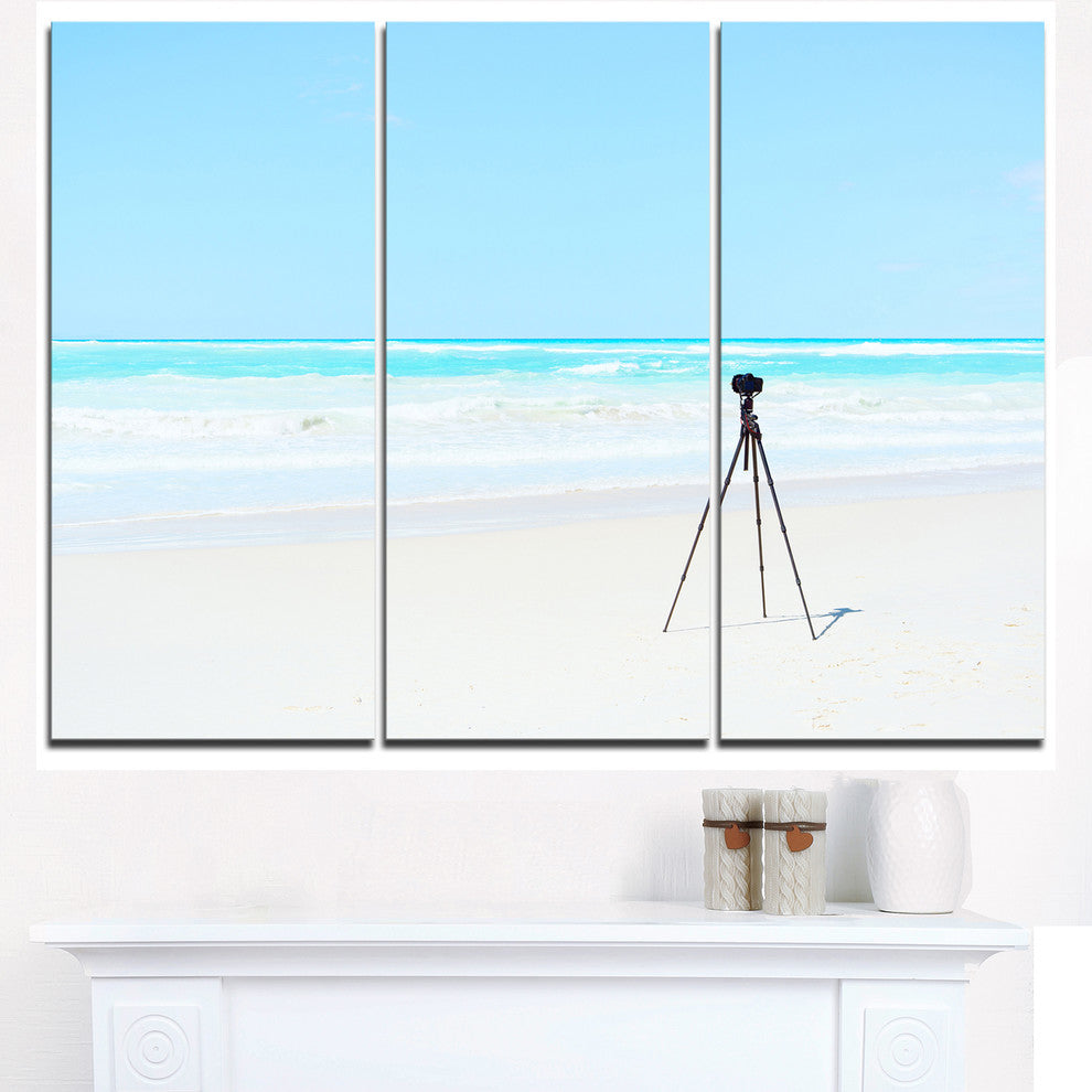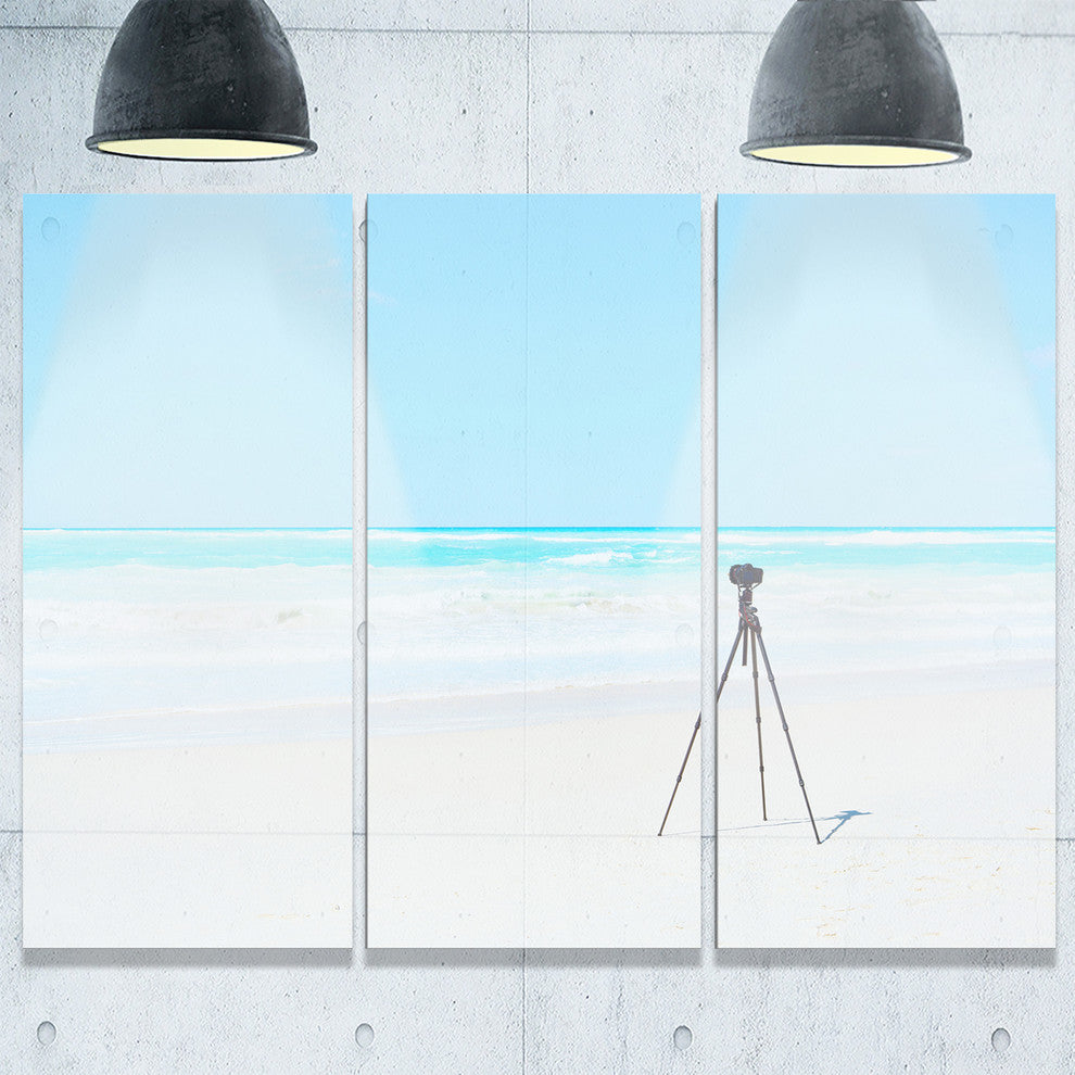 "Digital Camera and Tripod on Beach" Metal Wall Art, 3 Panels, 36"x28"