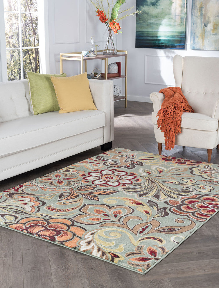 The botanical elements in the Dilek Transitional Floral Rug combine to create a tropical flair worthy of admiration. With a background dyed in cranberry red, snowy ivory, pear green, ecru gold, mushroom taupe, espresso brown, and russet, this is a playful rug sure to add charm to any home. This rug comes in various sizes and also in round to create a unified look throughout the home. Outfit your home with quality pieces like this that highlight your distinct decorating style.Machine made of polypropylene to be durable and carefreeSoft polypropylene is naturally stain-resistantVacuum oftenSpot clean when necessary using mild detergent and no bleachColor: SeafoamShape: RectangleDimensions: W 63" x D 87" x H 0.39"Please Note: Due to differences in computer monitors, some product colors may vary slightly.
