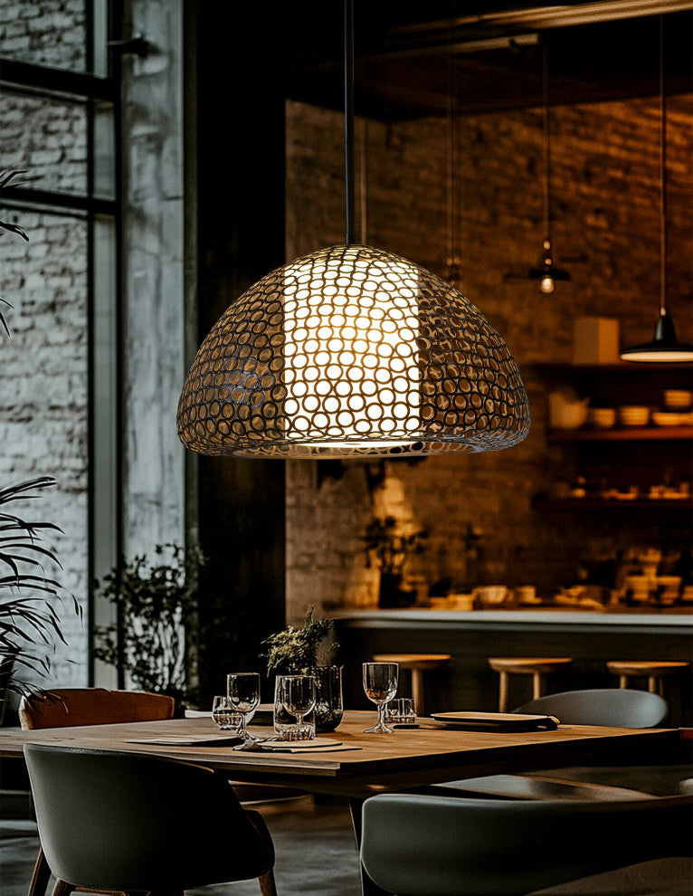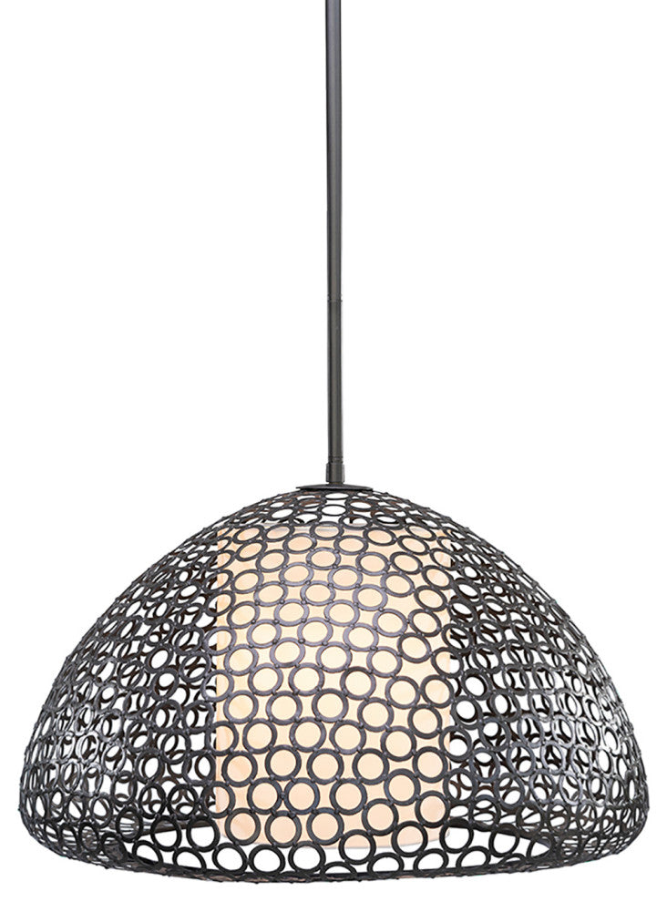 The Dilston family features a dome-shaped metal frame with an intricate perforated pattern, expertly crafted from welded circular rings. The cutouts cast unique shadow effects, while a fabric shade inside softens the light, creating a warm, diffused glow, making this piece as functional as it is decorative. Perfect for enhancing contemporary interiors, the Dilston family transforms any room into a sophisticated and inviting space.Features:Meticulously crafted by skilled artisansAdjustable Height: Includes (3) 12" + (1) 6" stems & hang-straightTranscends functionality to become captivating works of artRequires 3 A19 E26 Max Replaceable LED (60 max wattage) (Not Included)