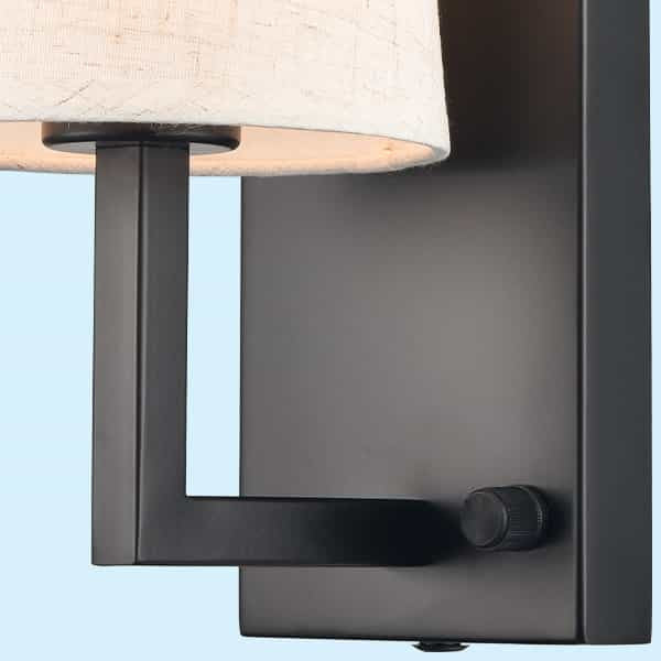 Finished in black color, the wall sconce consists of rectangular metal back plate and bucket-shape beige fabric lamp shade, Modern style and simple design