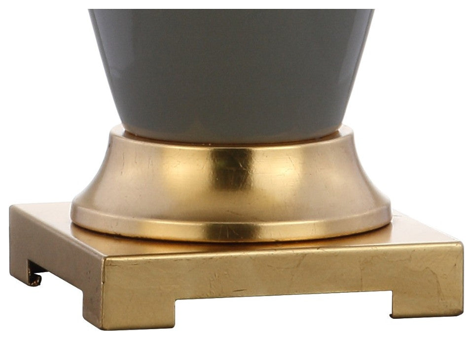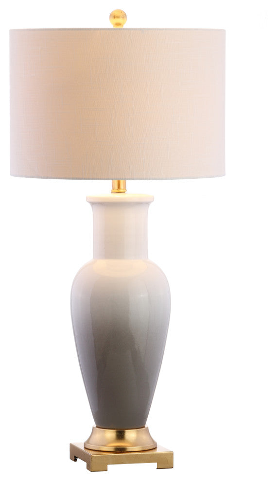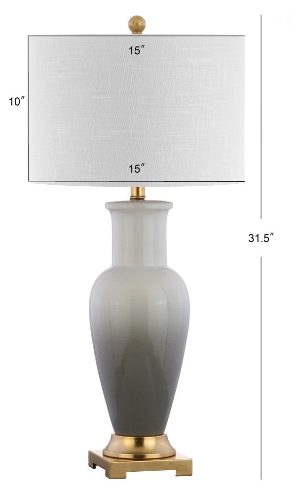 Dip-dye, shibori, and gradient washes are some of the hottest trends in fashion, and this lamp perfectly translates the same look for the home. With a gray base that transitions to white, a modern glaze technique is made traditional by the addition of a brass pedestal and accents. Topped with a matching finial and cotton drum shade, this style-centered moment is sure to be an instant classic.-A gradient glaze effect is the signature accent on this urn-shaped lamp-100% cotton hardback drum shade in white-Beautiful to display or easy to conceal: the 60" cord is silk-wrapped-On-off rotary switch on socket-Takes one bulb and compatible with any 12W LED or 100W incandescent or 23W CFL-Eco-friendly 9W LED bulb included-UL Listed-Color: White/Grey with white shade-Body Material: Ceramic / Metal-Base Material: Iron-Finial Material: Resin-Finial Color: Gold Leaf-Harp Color: Gold-Includes: One (1) lamp(s)-Minor Assembly Required-Lamp: 31.5 inches high x 15 inches wide x 15 inches deep-Shade: 10 inches high x 15 inches wide x 15 inches deepYou see a lamp.We see a decorative work of art.A perfectly curved shade casts a dramatic shadow on a floor. A silk cord you never want to hide. LED lightbulbs: as easy on the environment as they are on the eyes. The JONATHAN Y Lighting collection considers every detail from impeccably sourced materials to designer styling. And our prices are so attractive, we''ve transformed a functional necessity into a fashion accessory.JONATHAN Y Lighting - a fashion revolution in home decor.