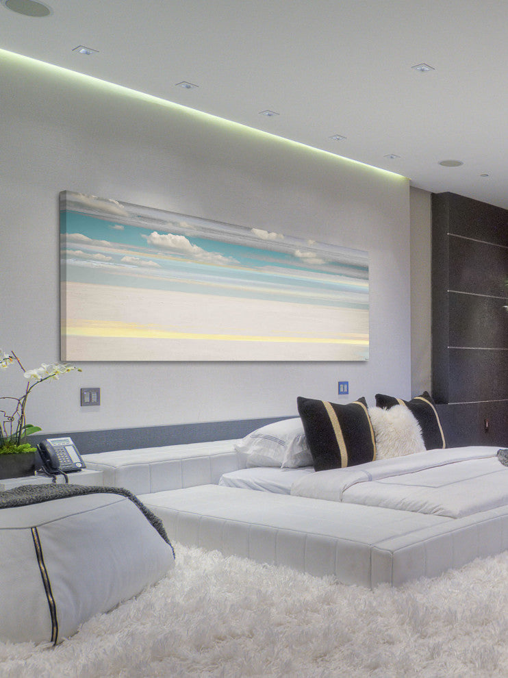 Striking and unique, the "Distant Clouds" Print on Canvas by Parvez Taj will bring your walls to life. Printed on canvas, this 30 inch wide by 10 inch tall contemporary artwork will make a statement in any living room, dining room, or bedroom.- Fine art canvas print by Parvez Taj- Professionally hand stretched- Gallery wrapped in sustainable, non-warping wood- Arrives ready to hang- Made in the USA- Includes a certificate of authenticity- Artist signature on the front