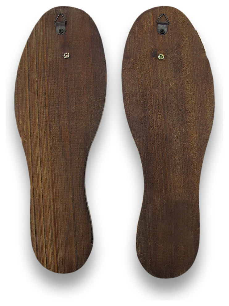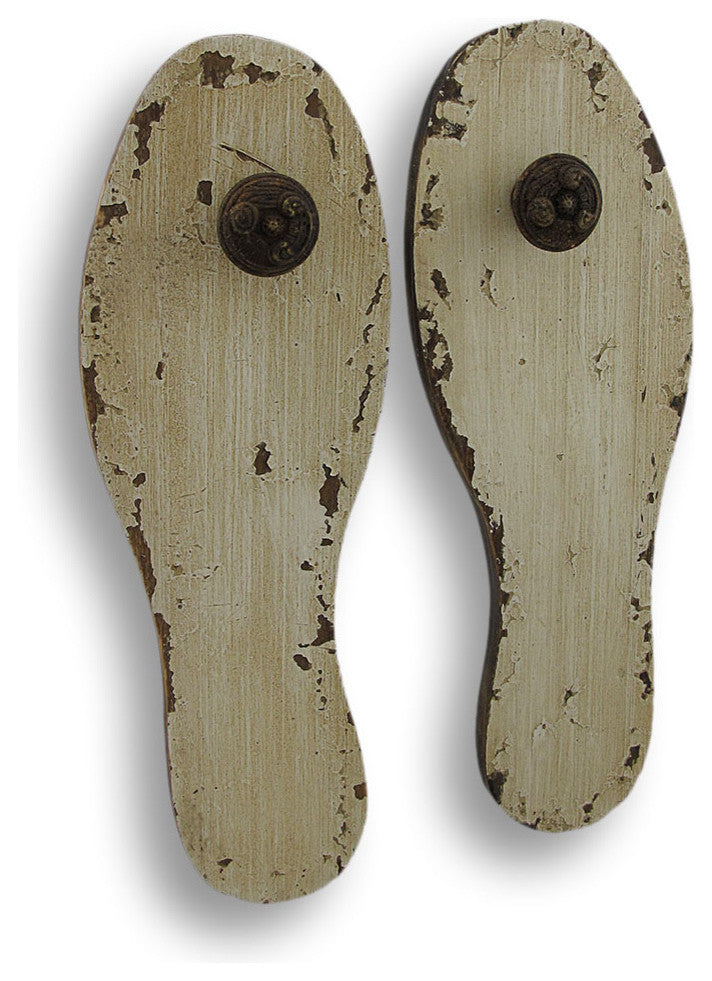 Add a unique accent to your home or office with this pair of wooden wall hooks. They are shaped like shoe soles and have a distressed, antique white finish with decorative wooden pegs. Each plaque measures 10 3/4 inches tall, 3 3/4 inches wide, and 1 1/2 inches deep. They are perfect for hanging lightweight items, and they look great side by side or staggered.