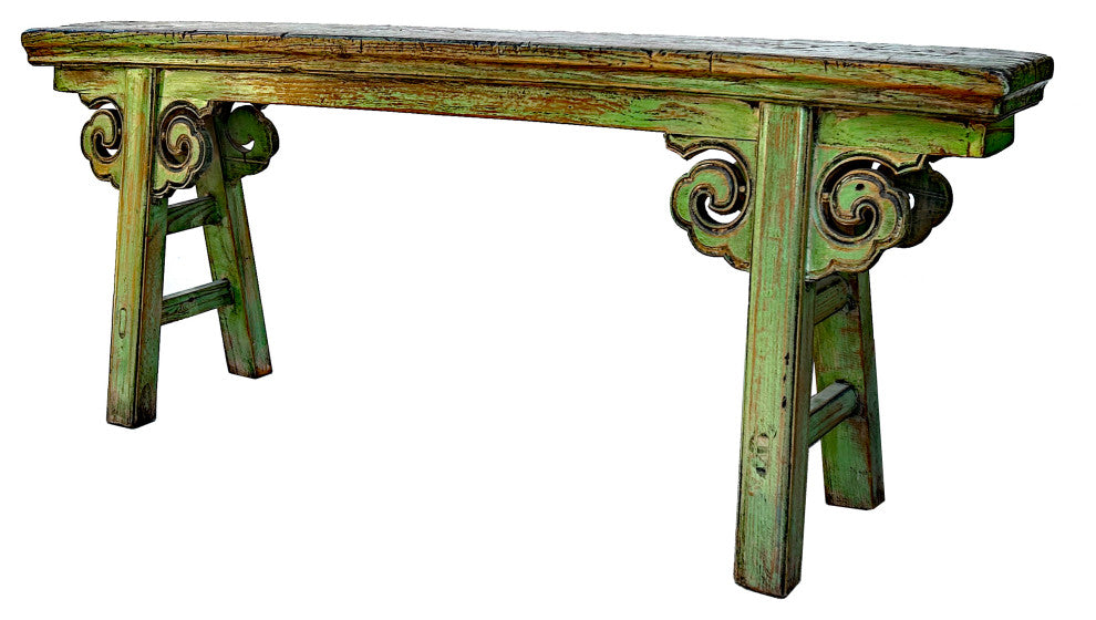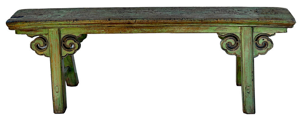 Transform your space with this charming distressed lime green scroll apron slim narrow bench, a perfect blend of vintage allure and practical design. The soft lime green finish, artfully distressed for a rustic look, accentuates the intricate scrollwork on the apron, adding a touch of elegance to its slender silhouette. Ideal for tight spaces like hallways, entryways, or cozy corners, this narrow bench offers both seating and style without overwhelming your decor. Crafted for durability and timeless appeal, this unique piece is a must-have for anyone looking to infuse their home with character and sophistication"”shop now to bring this beauty home!Dimensions: w50" x top d6.5", legs d10.5", h20"Origin: ChinaMaterial: Elm WoodCondition: handmade, original rough bump marksWork: ship in one piece, a variation on the wood grain patternUSA domestic continental buyers of 48 states pay $220 shipping (buyers of Hawaii, Alaska, US Islands, Florida Keywest, and Canada pay the extra shipping cost). Insurance and handling charges are already included in the shipping cost. In-store pick-up is highly welcomed if you are in San Francisco Bay Area. (No charge)